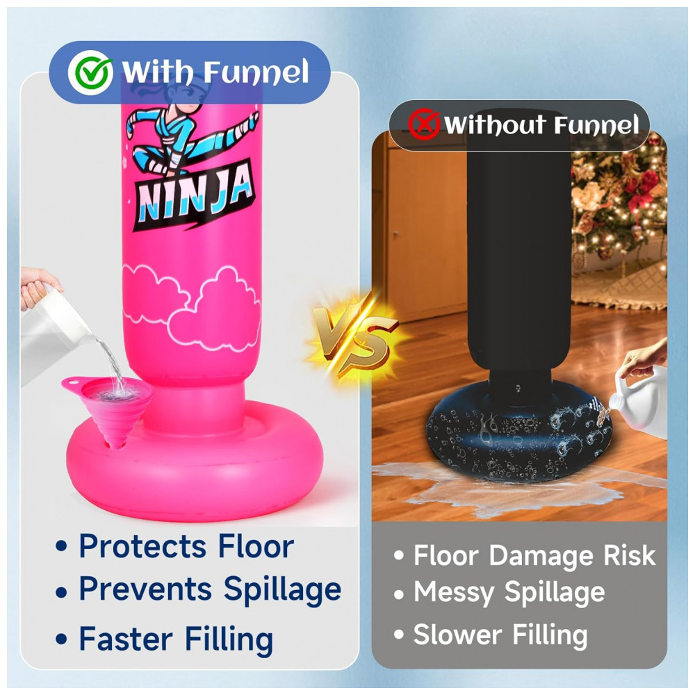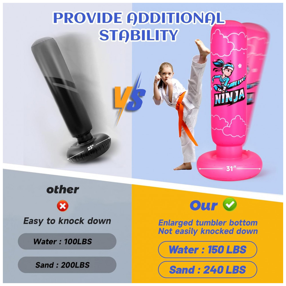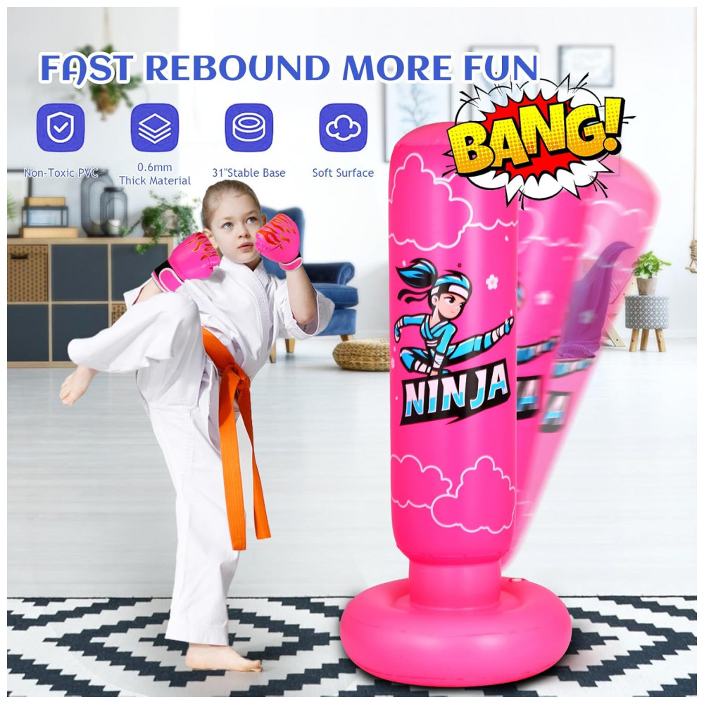O saco de pancadas inflável infantil Onirii ninja rosa é um conjunto de boxe para crianças com aproximadamente 168 cm de altura e base circular de cerca de 78 cm de diâmetro, indicado para atividades recreativas de boxe, karatê, kung fu e taekwondo. A estrutura inflável é confeccionada em PVC com espessura de 0,6 mm, com superfície lisa e base preenchível com água para proporcionar retorno automático à posição vertical após os golpes.