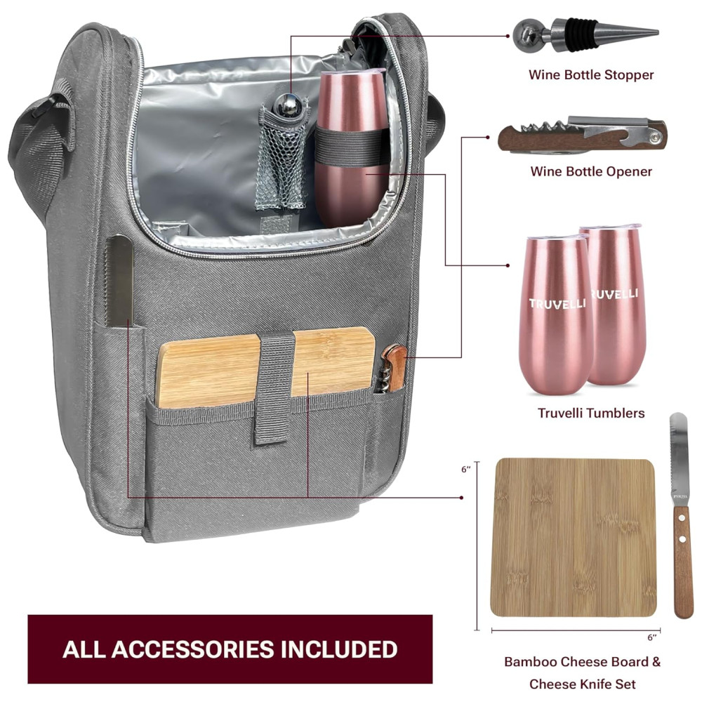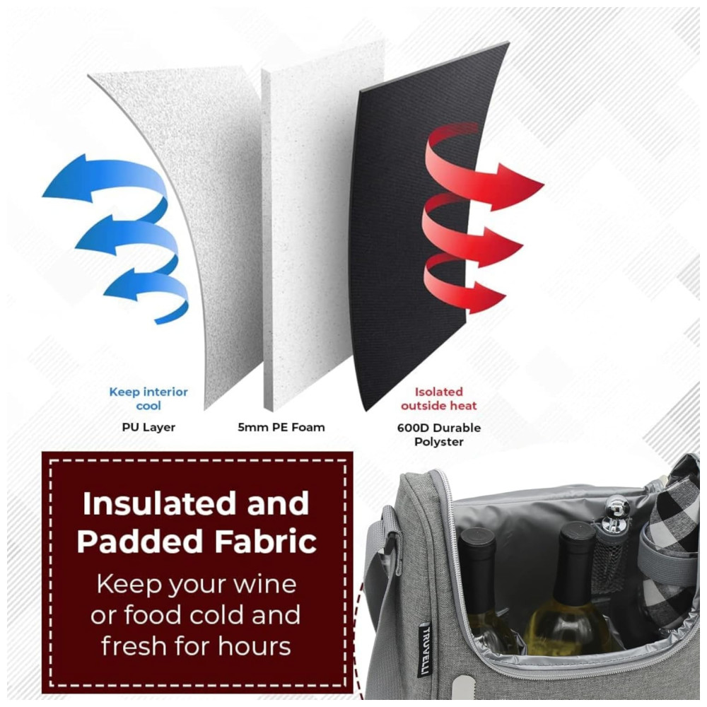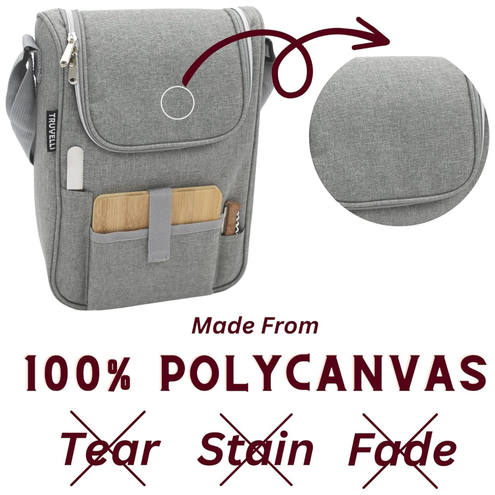 Sacola Térmica para Vinho Truvelli Portátil 2 Garrafas com Queijo à Prova d’Água em Lona Preta – Kit de Piquenique com Tampo de MadeiraPlush Picnic