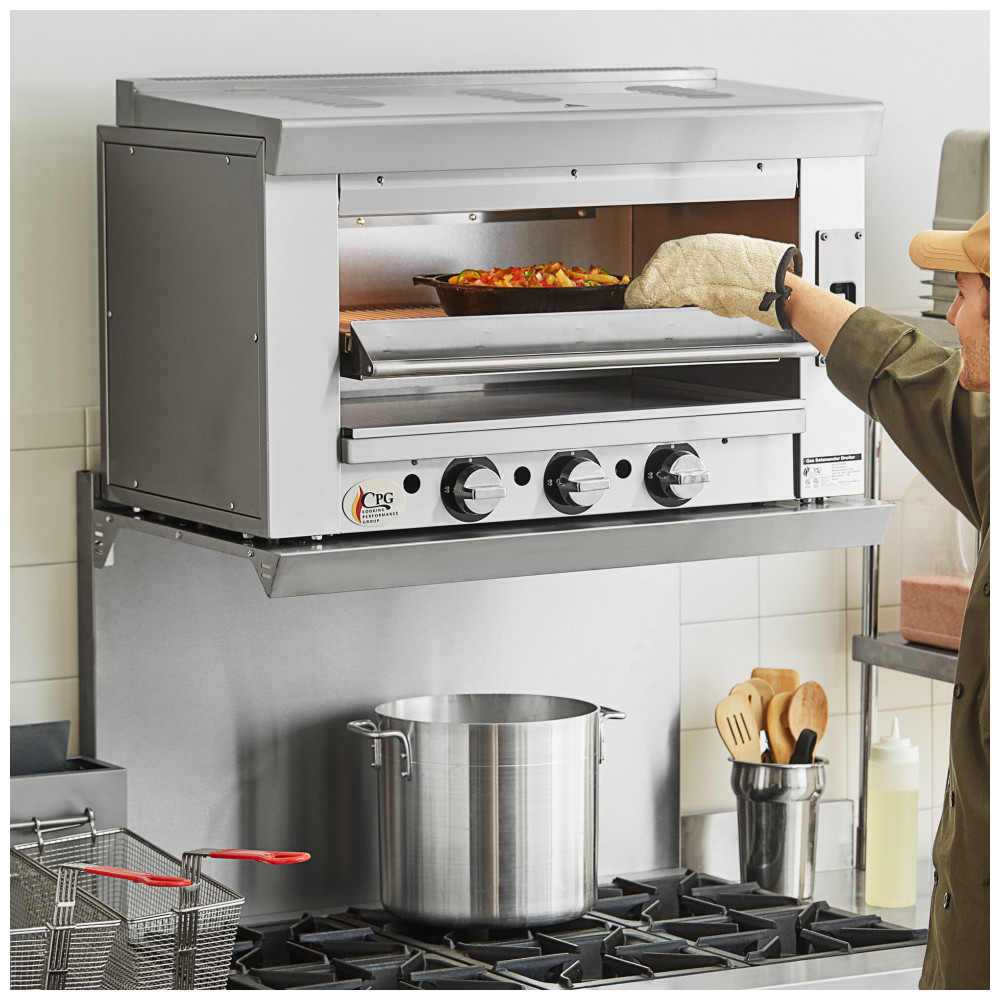 A Cooking Performance Group S-36-SB-N é uma salamandra broiler infravermelha a gás natural, montada sobre fogão, para grelhar, tostar e finalizar pratos em cozinhas comerciais. Equipada com queimador infravermelho de 36.000 BTU, válvulas de gás ajustáveis e piloto permanente para ignição instantânea, possui grelha removível de grande capacidade e gaveta coletora de migalhas em aço inoxidável.