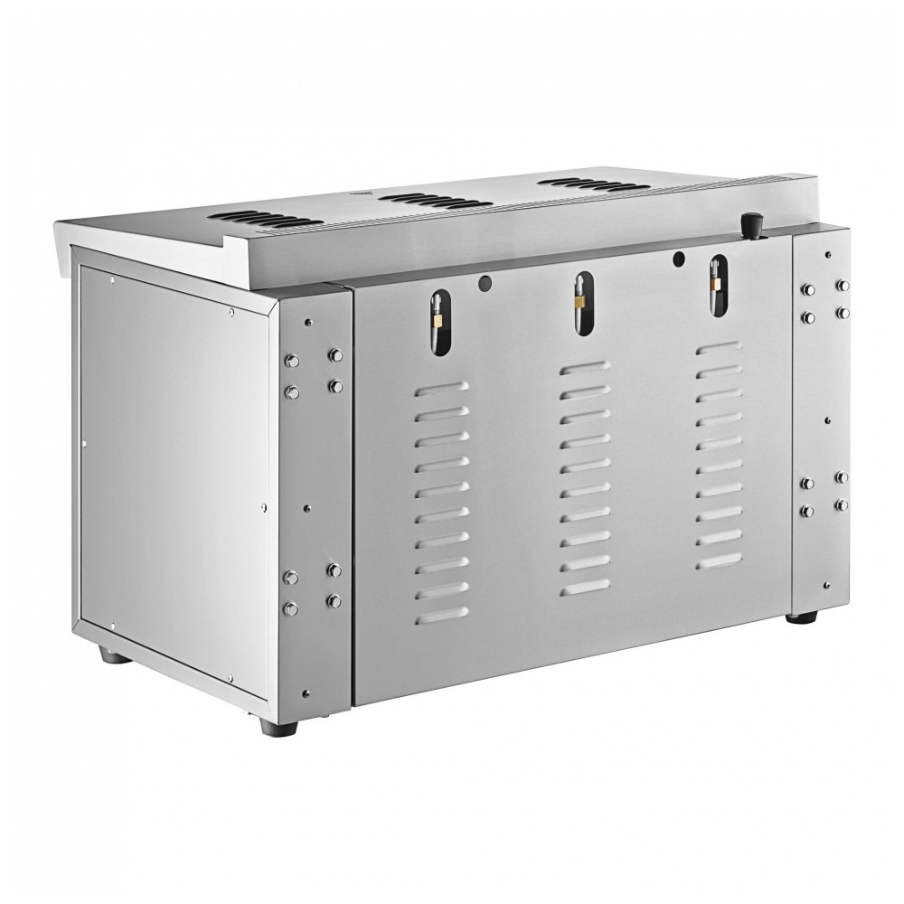Medindo 89 cm de largura, 53 cm de profundidade e 59 cm de altura, opera na faixa de 27°C a 204°C. Requer conexão de gás natural de 1,3 cm, compatível com instalação sobre fogão para otimizar espaço em cozinhas profissionais.