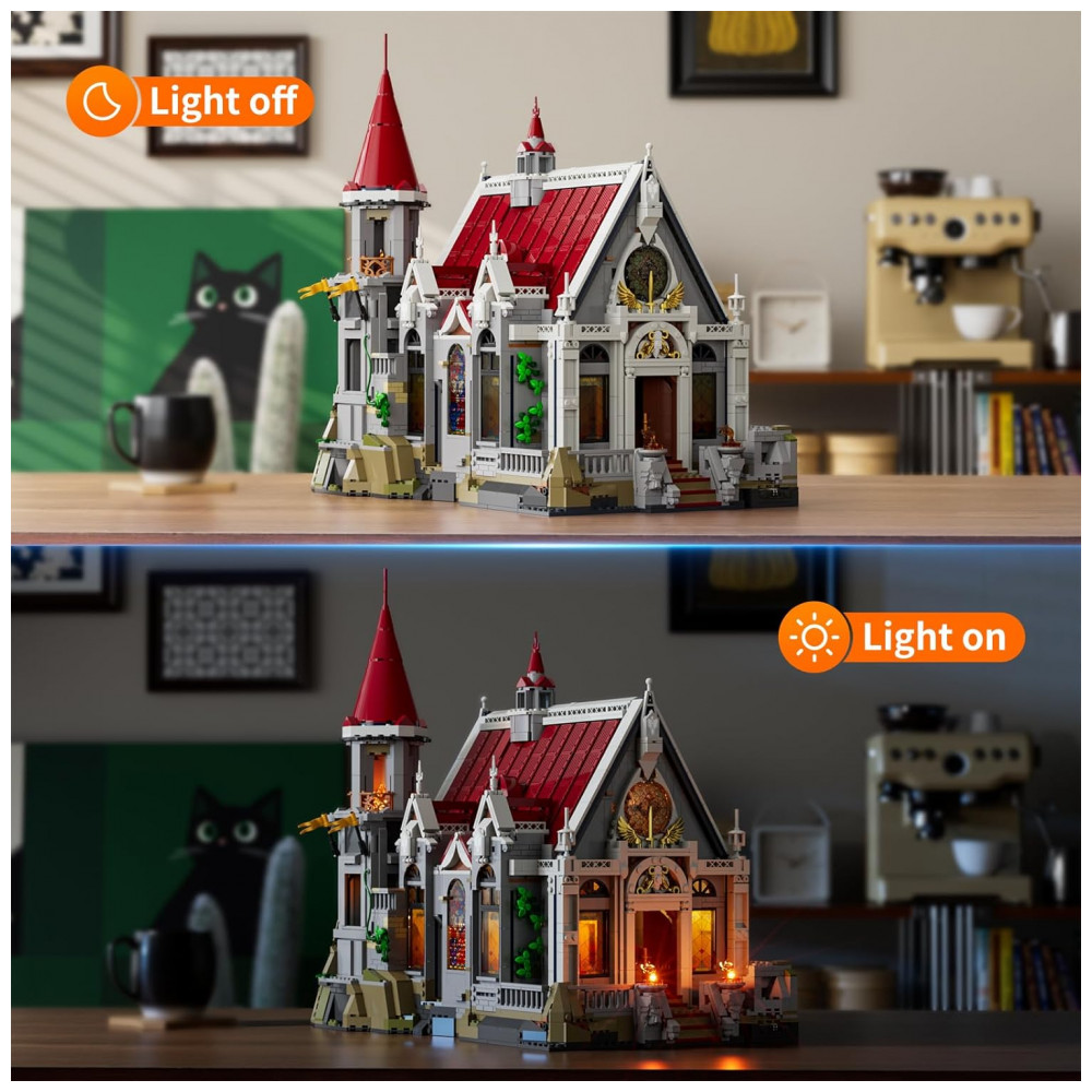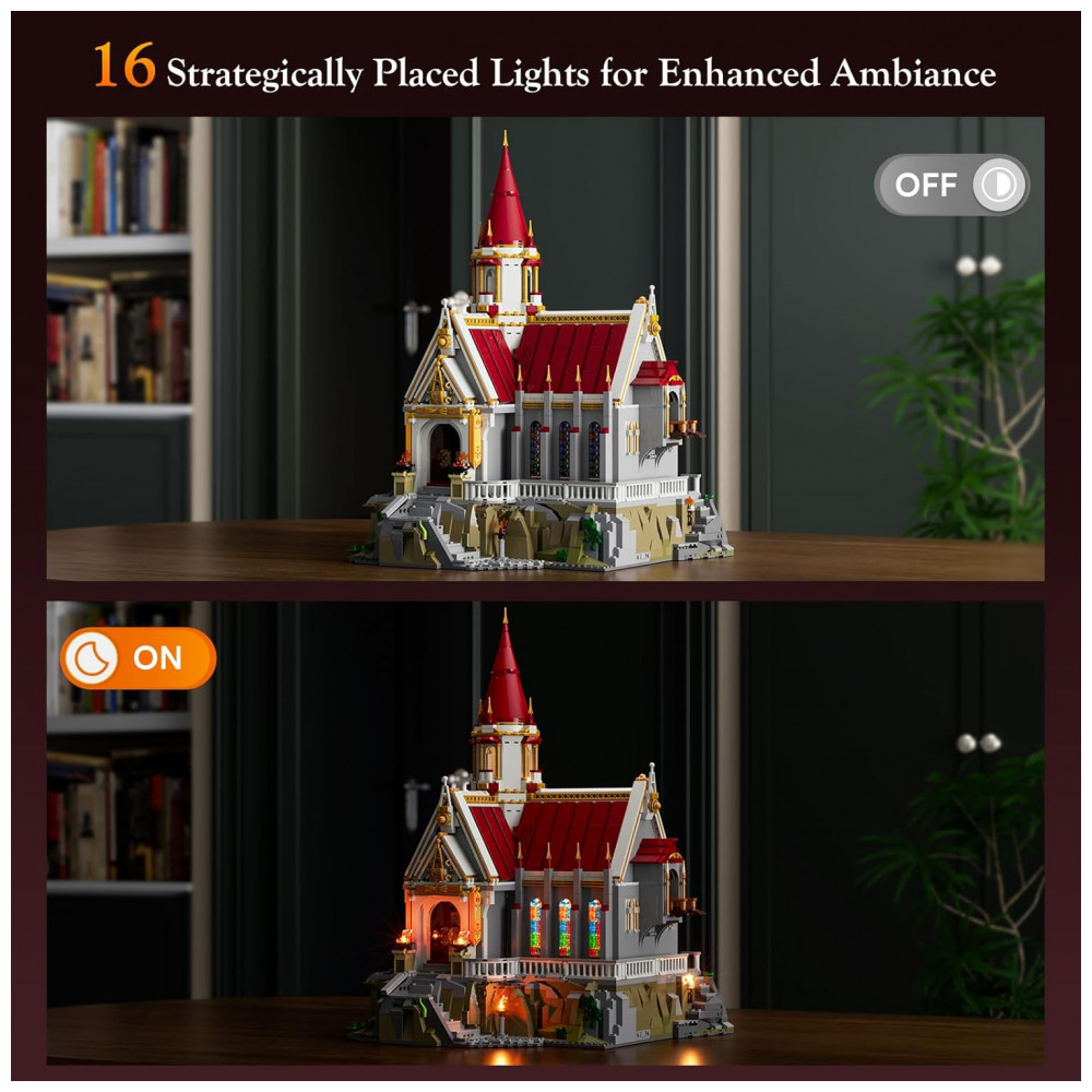 O kit Lumibricks Salão Banquete Castelo Medieval integra sistema exclusivo de iluminação com 15 pontos LED posicionados estrategicamente (pilhas não inclusas), projetados para atravessar quatro janelas de vitral em cada lateral, gerando refrações coloridas autênticas. Inclui 42 elementos impressos formando 25 designs exclusivos, dispensando aplicação de adesivos para acabamento profissional.