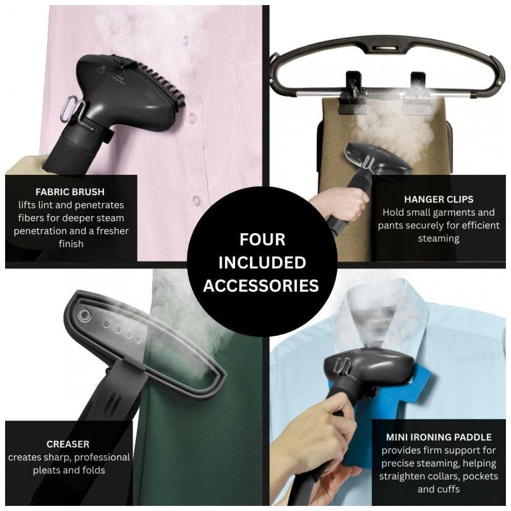 A rotina de manutenção é simplificada com 3 decalcificantes inclusos, prolongando a vida útil do vaporizador. Com potentes 1500 Watts de vapor contínuo, suaviza e remove rugas dos tecidos. O tanque removível de 1,8 litros proporciona mais de 60 minutos de vapor contínuo para passar várias peças ao mesmo tempo. O design funcional com suporte duplo oferece uma estrutura robusta e os práticos pedais de vapor facilitam o controle, reduzindo o esforço nas costas. Para armazenamento, possui rodas, barras de suporte de alumínio telescópicas e cordão de energia retrátil. A placa de vapor em aço inoxidável regula a temperatura do vapor, removendo rugas de forma mais rápida e eficiente.