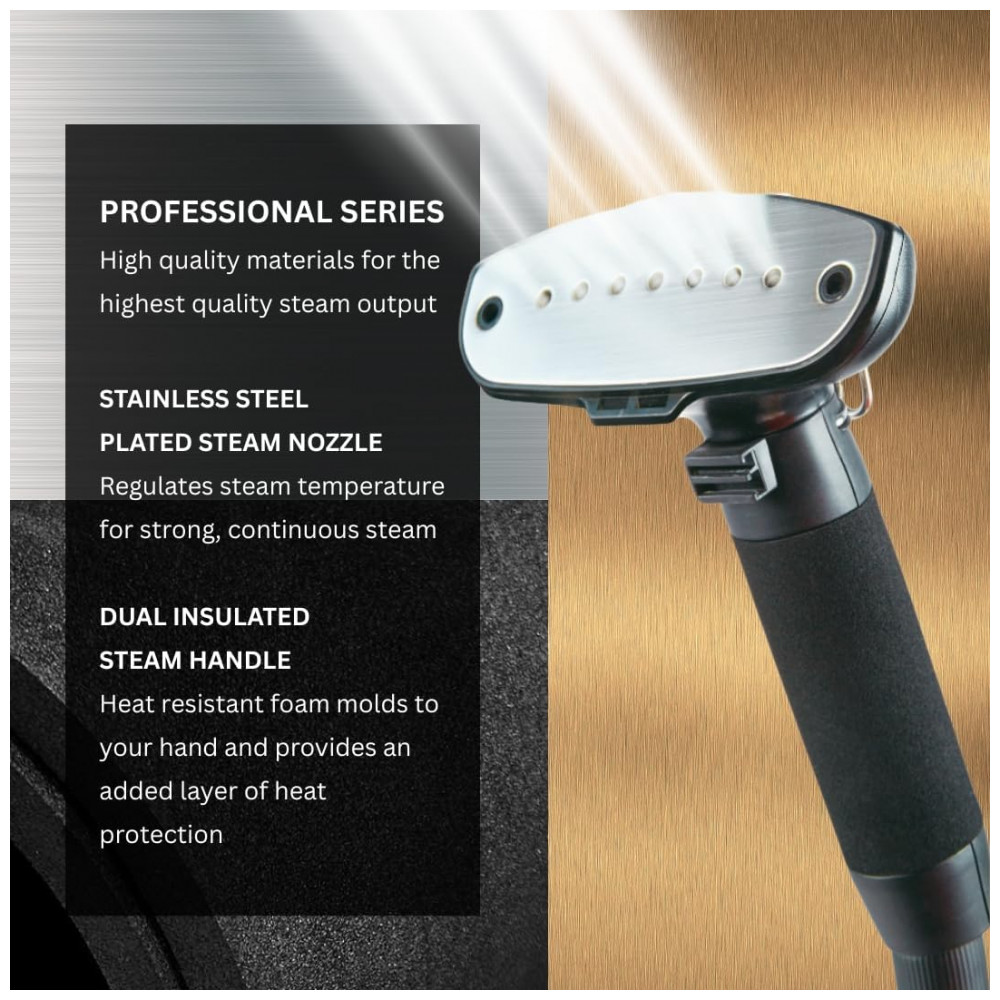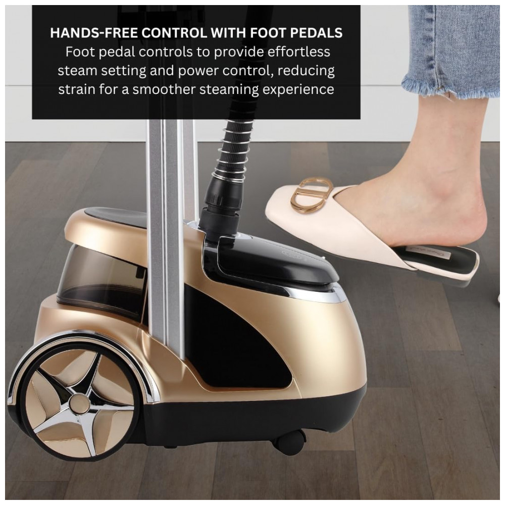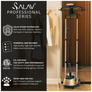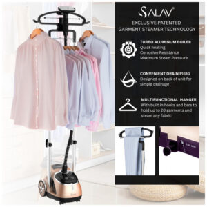 Com 1500 watts de potência, este vaporizador oferece um vapor contínuo e potente que suaviza e desamassa as rugas dos tecidos. O tanque removível de 1,8 litros proporciona mais de 60 minutos de vapor contínuo. Seu design conta com estrutura de suporte dual, controle de vapor por pedal, tanque translúcido removível e placa de vapor em aço inoxidável para tornar a remoção de rugas mais rápida e eficiente. Além disso, possui rodas giratórias e barra de suporte telescópica de alumínio para facilitar o armazenamento. Aproveite a eficiência e elegância do SALAV Limited Edition Professional Series Dual Bar Garment Steamer!