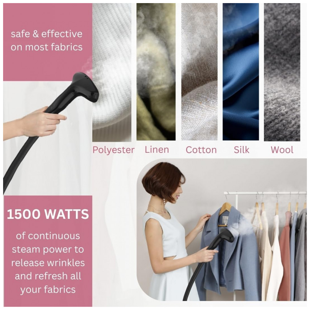 VERSÁTIL: Suavize com segurança roupas, cortinas, estofados e muito mais com vapor acima de 93°C. A mangueira trançada de isolamento duplo regula a temperatura. POTENTE: Com 1500 watts de vapor constante e potente, suaviza e alisa rugas em tecidos. DURADOURO: O tanque de água removível de 1,8 litros oferece mais de 60 minutos de vapor contínuo. AJUSTÁVEL: Cabide ajustável patenteado que se estende para se adequar perfeitamente a todas as suas roupas. ARMAZENAMENTO: Cabide dobrável combinado com a haste de alumínio telescópica permite um armazenamento fácil e compacto. INCLUI 1 PACOTE DESCALCIFICANTE: Os Pacotes Descalcificantes da SALAV ajudam a remover depósitos minerais e acúmulos.