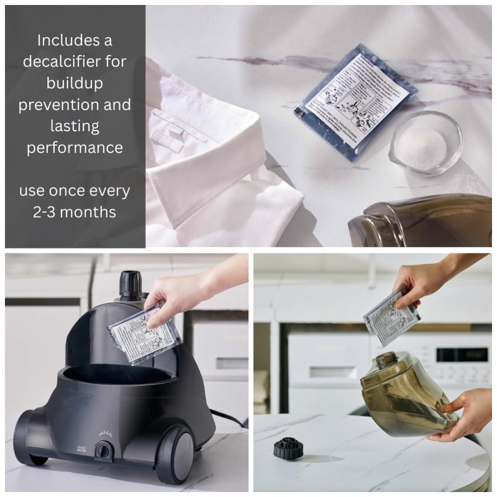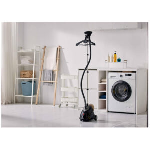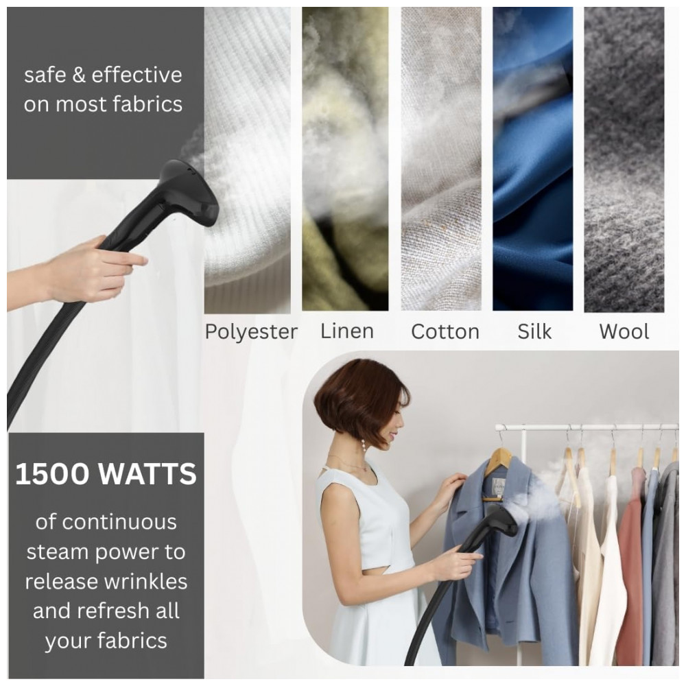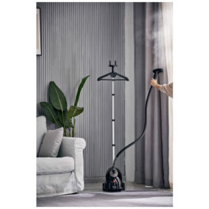 Alise com segurança roupas, cortinas, estofados e muito mais com o vapor atingindo mais de 93°C. A mangueira tecida de isolamento duplo aprimorado regula a temperatura. Com 1500 watts de potência, o vapor constante amacia e desamassa rugas nos tecidos. O tanque removível de 1,8 litros proporciona mais de 60 minutos de vapor contínuo. O suporte ajustável patenteado se estende para se ajustar perfeitamente a todas as suas peças, facilitando o armazenamento graças ao suporte dobrável e ao poste de alumínio telescópico. Inclui 1 sachê de descalcificação para remover depósitos minerais.