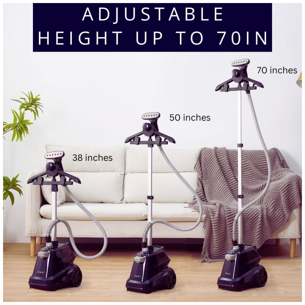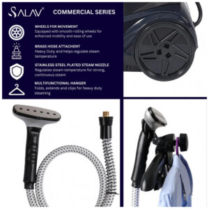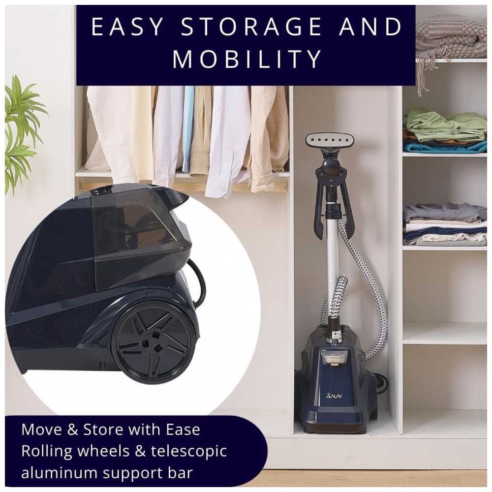 O Vaporizador de Roupas SALAV é perfeito para uso comercial e residencial. Quando o reservatório fica vazio, a luz do vaporizador passa de azul sólido para azul intermitente e emite um beep por 90 segundos. Após o alerta, emite um beep final e a luz fica vermelha indicando desligamento. Com rodas giratórias de 360 graus, barra telescópica de alumínio ajustável e desempenho de alta qualidade, este vaporizador remove rugas, odores e bactérias, sendo ideal para tecidos delicados e grossos. Com 1800 watts de potência, reservatório de 3 litros e mais de 90 minutos de vapor contínuo, é a solução para roupas impecáveis e desodorizadas. Além disso, o suporte multifuncional versátil garante praticidade ao pendurar roupas com segurança.