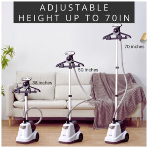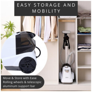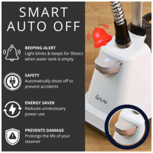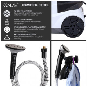 O Vaporizador de Roupas SALAV é perfeito para uso comercial e residencial. Com indicador luminoso e alerta sonoro, ele emite um sinal quando o tanque de água está vazio, garantindo um funcionamento correto. Sua potência de 1800 watts proporciona um desempenho excepcional, removendo rugas, odores e bactérias de tecidos delicados a grossos. Com um reservatório de água removível de 3 litros, oferece mais de 90 minutos de vapor contínuo. Suas rodas giratórias permitem fácil mobilidade, enquanto a barra de suporte telescópica ajustável proporciona praticidade ao guardar. Além disso, o vaporizador vem com acessórios inclusos, como escova de tecido e suporte para calças.