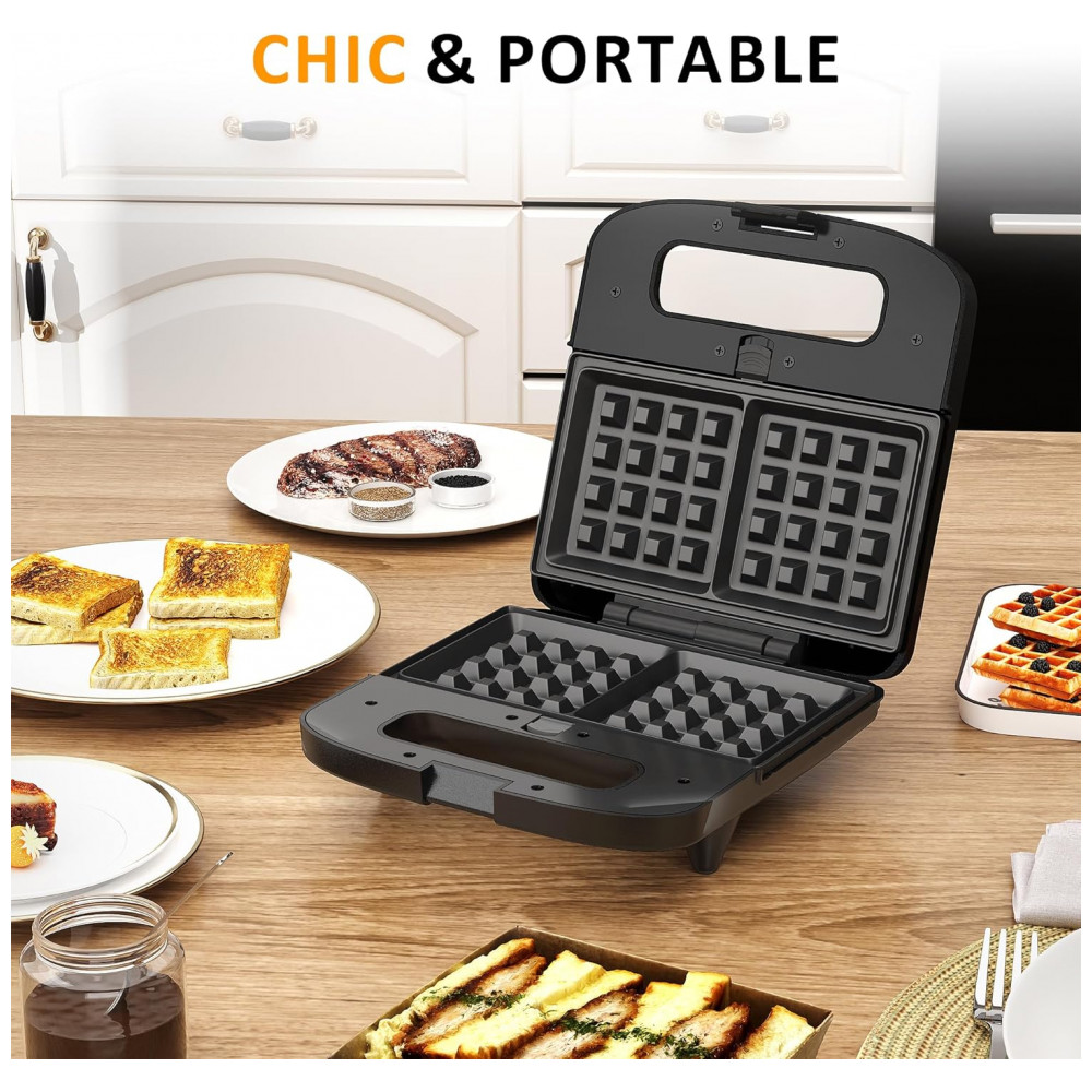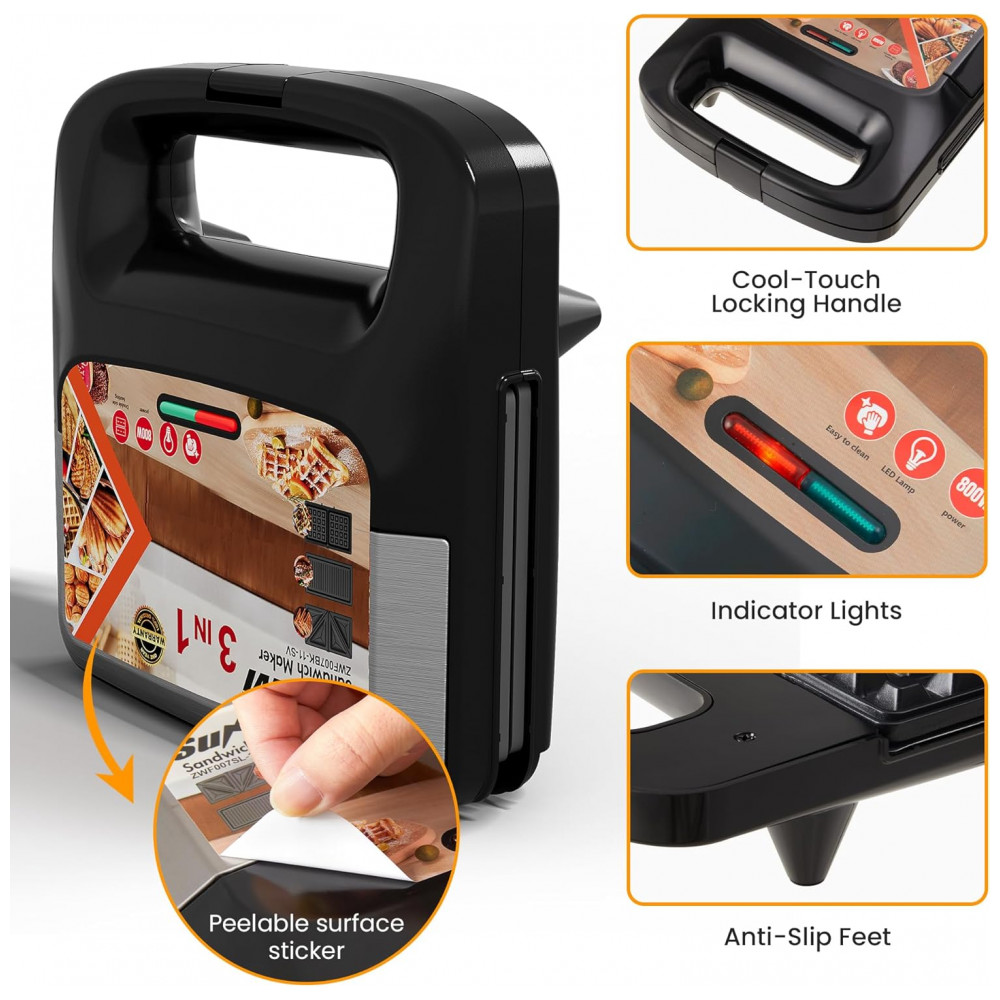A sanduicheira elétrica 3 em 1 SUNVIVI de 800W inclui três placas removíveis antiaderentes para preparo de sanduíches tostados, waffles crocantes e grelhados como bifes ou vegetais. Com aquecimento eficiente, atinge temperatura de operação em minutos após conexão elétrica, suportando preparos rápidos de lanches individuais ou familiares. Indicadores luminosos sinalizam funcionamento (vermelho) e preparo concluído (verde), com alça de toque frio e trava para manuseio seguro.