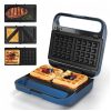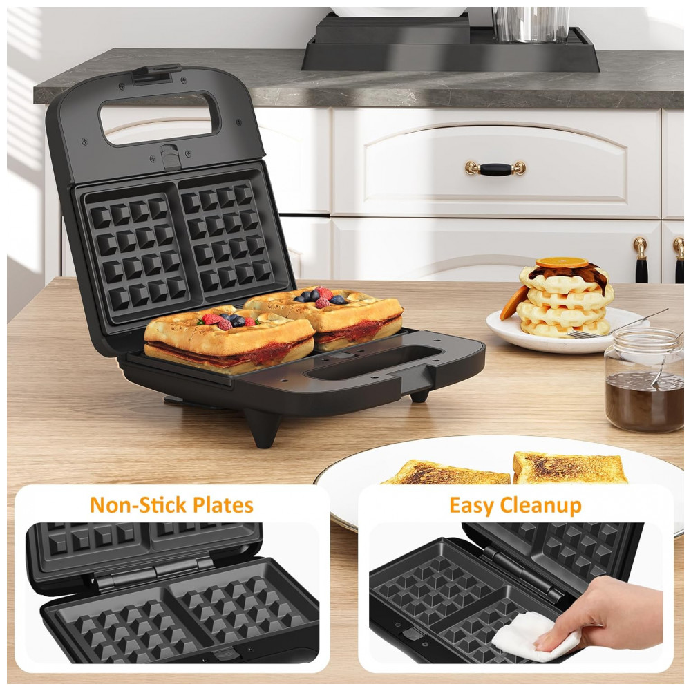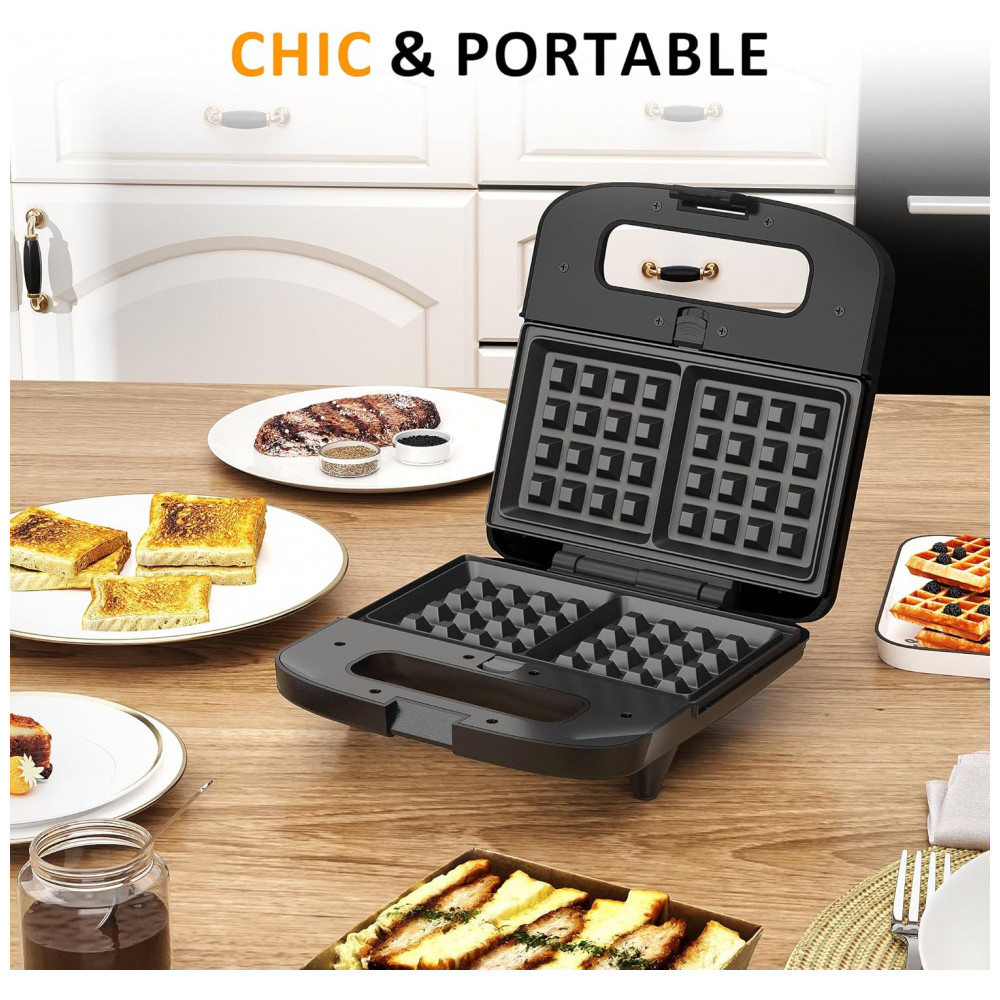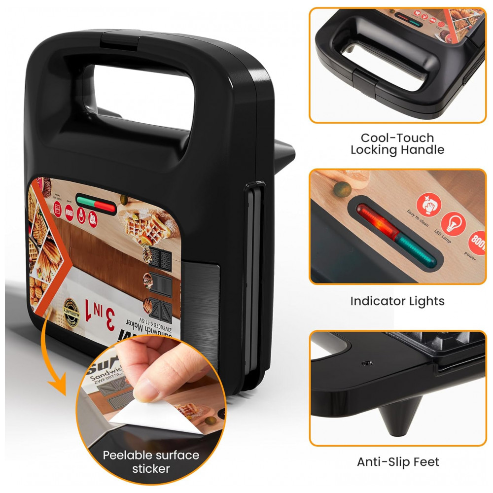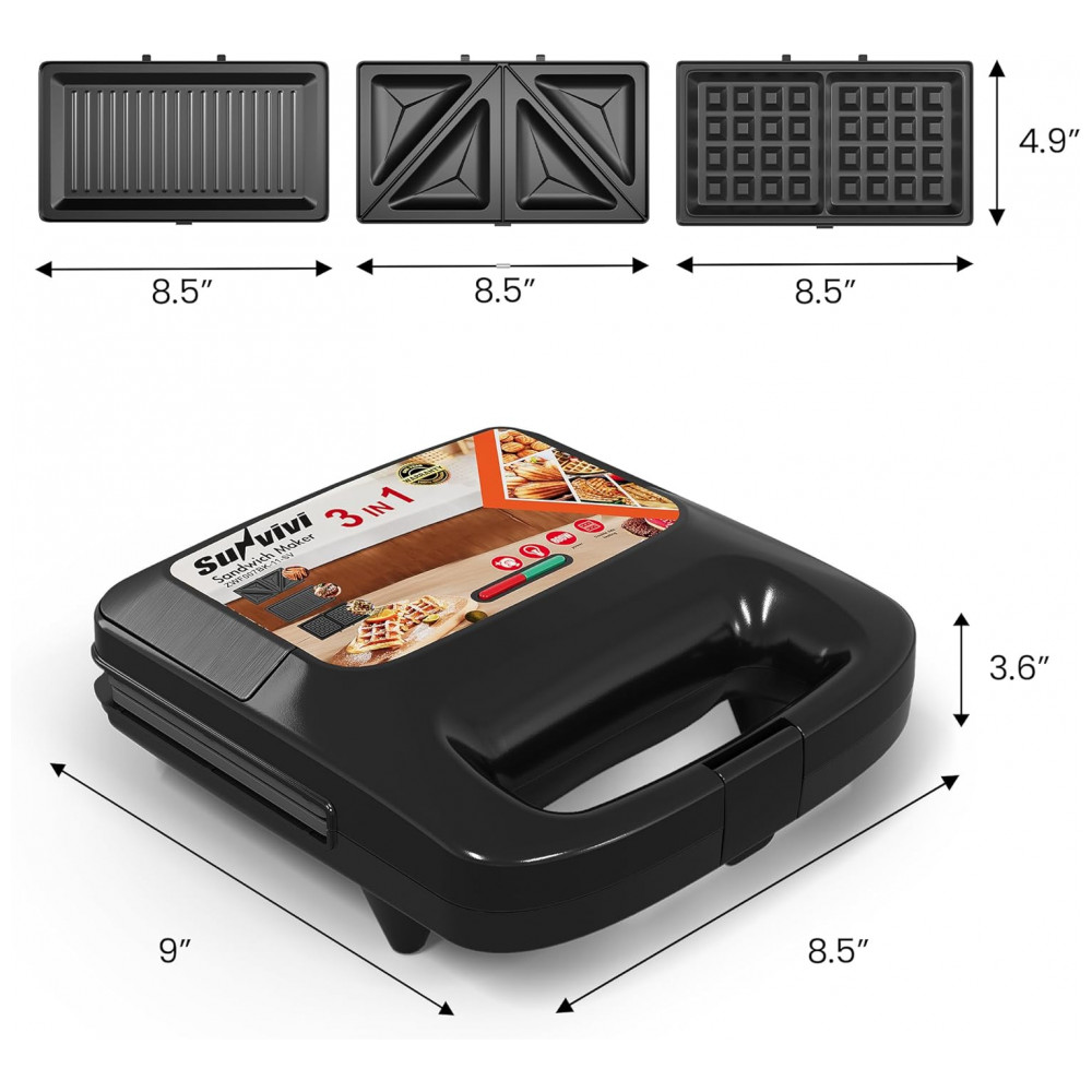A sanduicheira elétrica 3 em 1 SUNVIVI de 800W opera em 120V e inclui três placas removíveis com revestimento antiaderente para preparo de sanduíches tostados, waffles e grelhados como bifes ou omeletes. Indicadores luminosos sinalizam operação (vermelho) e aquecimento concluído (verde), com alça de toque frio e trava para manuseio seguro durante ciclos rápidos. Design compacto suporta uso doméstico ou portátil em viagens e camping.