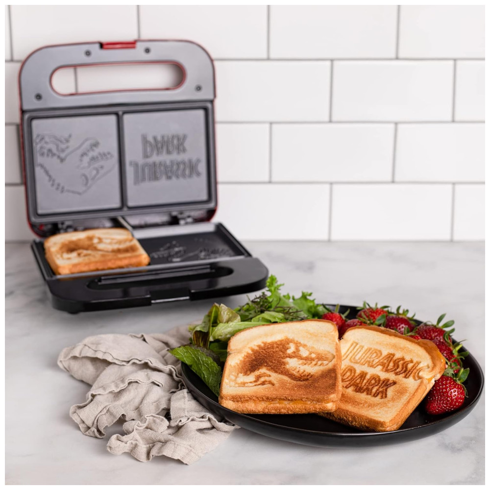 O Jurassic Park Grilled Cheese Maker da Uncanny Brands transforma o preparo de queijo grelhado em uma experiência épica. Este panini press e grill compacto é ideal para qualquer espaço, permitindo preparar duas porções de uma vez e ocupando pouco espaço na bancada. O design clássico inspirado em Jurassic Park adiciona um toque de aventura à sua cozinha, com as placas duráveis que imprimem a silhueta de um T-Rex e o icônico logotipo do Jurassic Park em ambos os lados do seu sanduíche prensado.