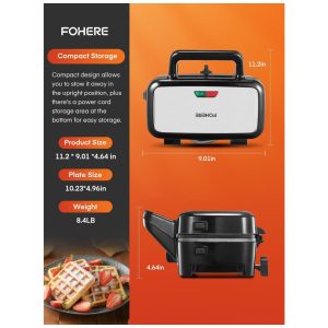 A FOHERE Panini Press é compacta e portátil, permitindo que você a transporte e armazene horizontalmente e verticalmente para economizar espaço. É ideal para viagens, escritório e escola, permitindo que você desfrute de comida deliciosa a qualquer hora e em qualquer lugar. A carcaça do waffleiron é feita de aço inoxidável resistente ao calor, os pés antiderrapantes e as alças isoladas garantem uma operação segura sem risco de queimaduras. A luz vermelha do indicador LED está sempre acesa, indicando quando o pré aquecimento ou aquecimento está concluído, enquanto a luz verde está apagada.