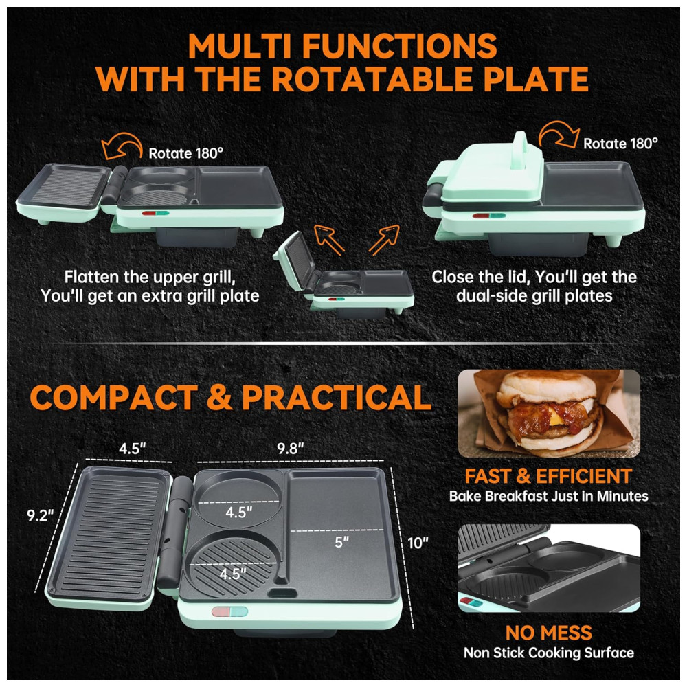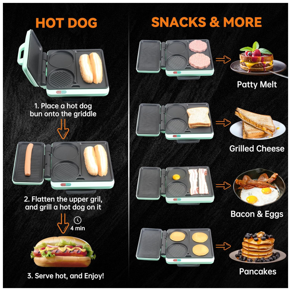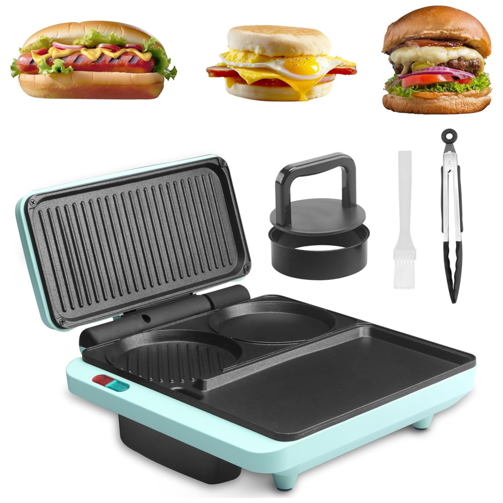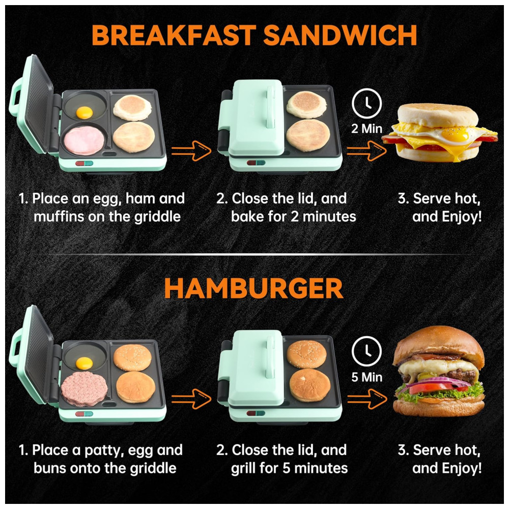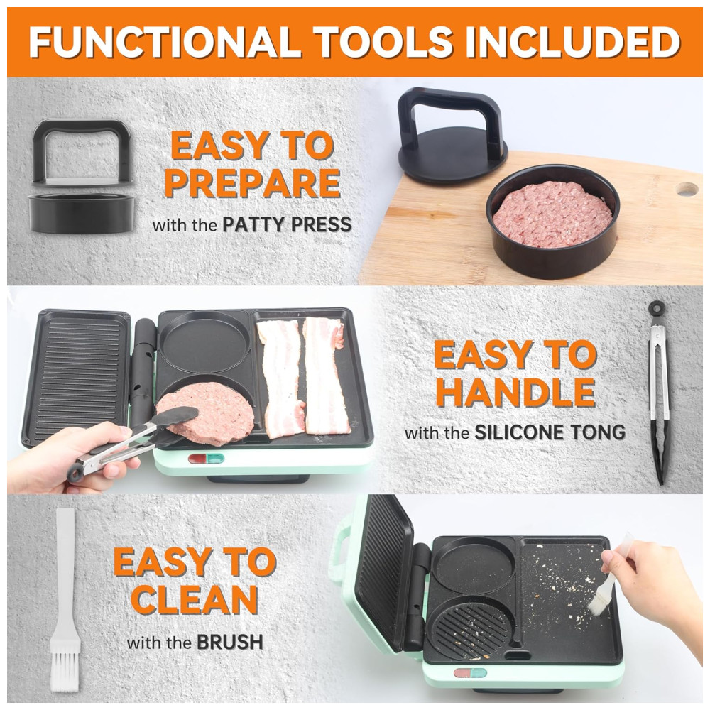 A embalagem inclui uma Burger Press e uma pinça de silicone, que irão ajudá lo a formar facilmente hambúrgueres de carne e virar e remover os alimentos dos pratos, respectivamente. Os cachorros, sanduíches, burgers e shots de café da manhã são perfeitos para compartilhar com seus filhos, parentes ou companheiros. É uma excelente opção para começar o dia, saboreando as refeições do meio da manhã, organizando confraternizações e participando de ocasiões especiais.