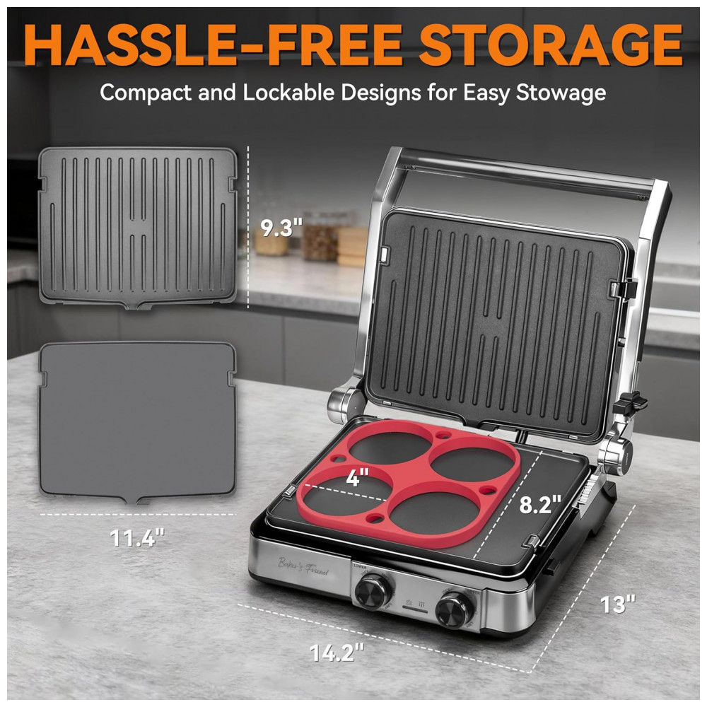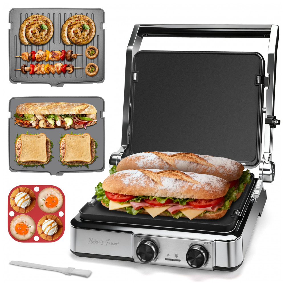 A sanduicheira elétrica Baker’s Friend 4-slice Panini Press Grill com 1400W permite preparar paninis, sanduíches grelhados, queijos tostados, panquecas, ovos fritos, carnes e vegetais com abertura 180° para uso como chapa. Tampa ajustável em aço inoxidável com mecanismo de trava adapta-se a espessuras variadas de recheios, suportando preparos simultâneos de 4 porções em cozinhas domésticas. Dimensões de 36,6 cm profundidade x 13,5 cm largura x 33 cm altura acomodam superfícies de bancada padrão.