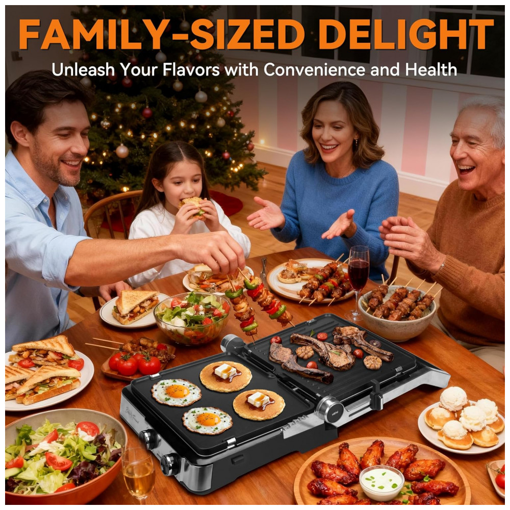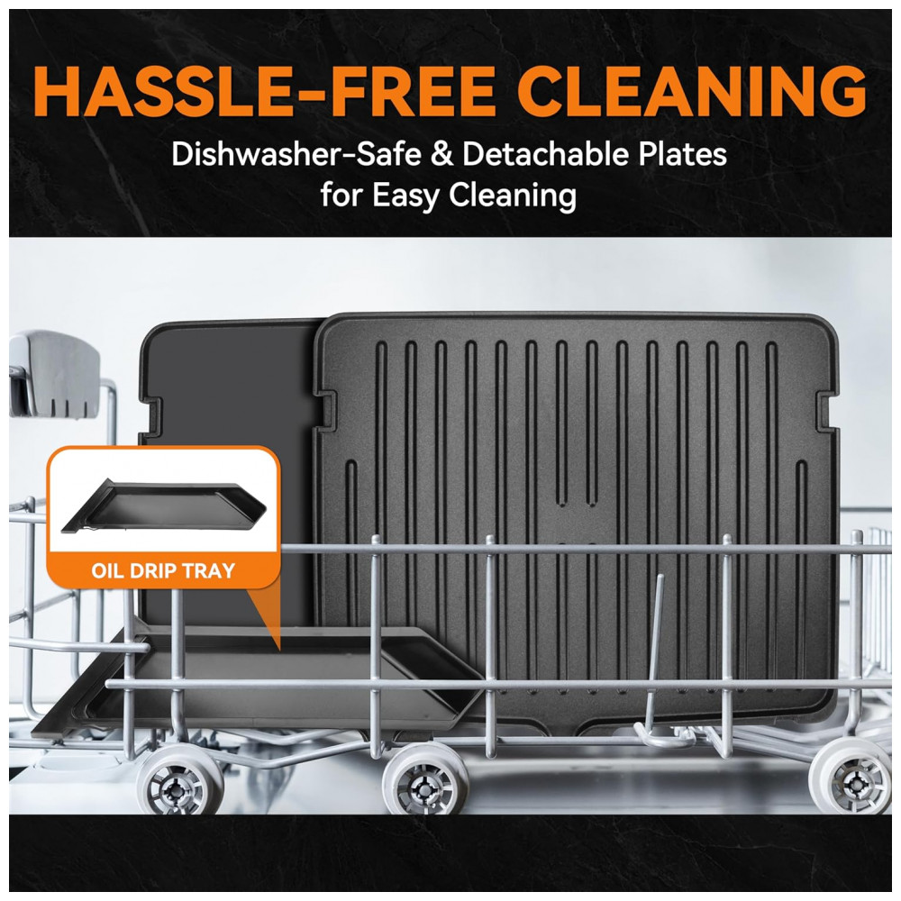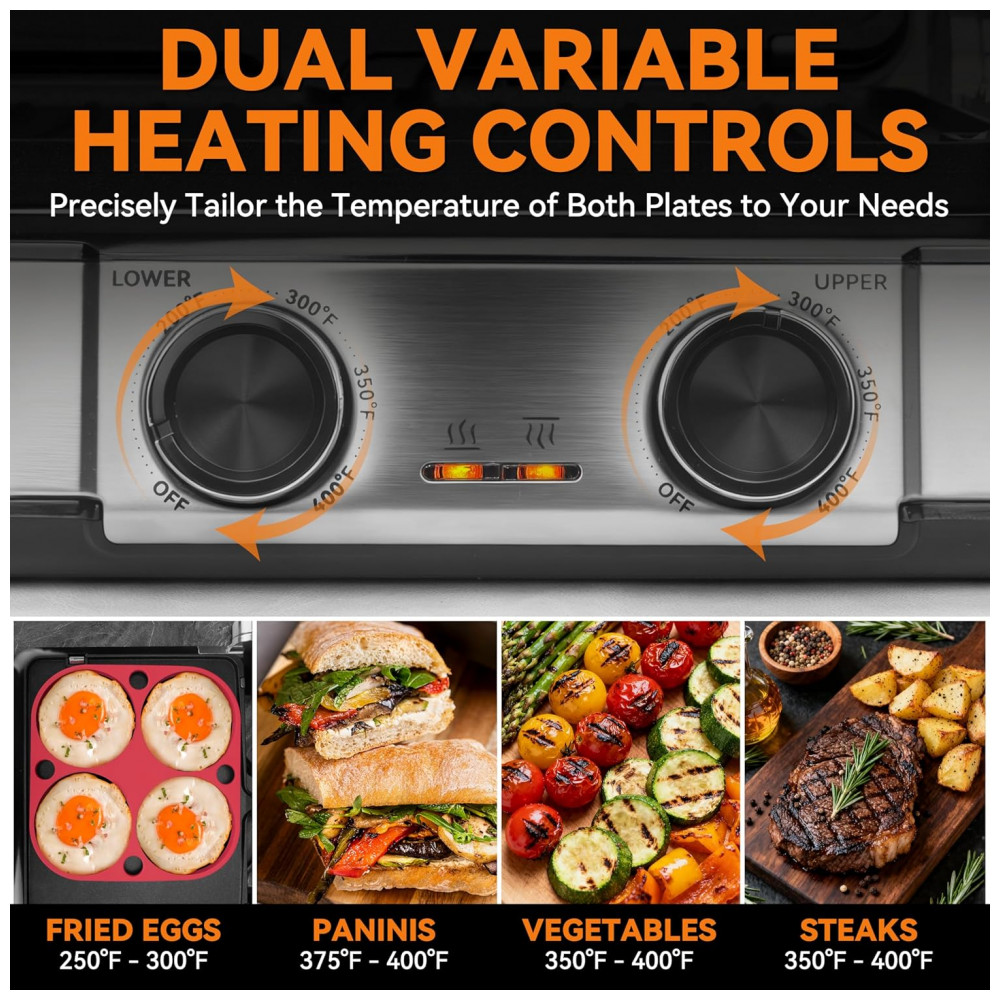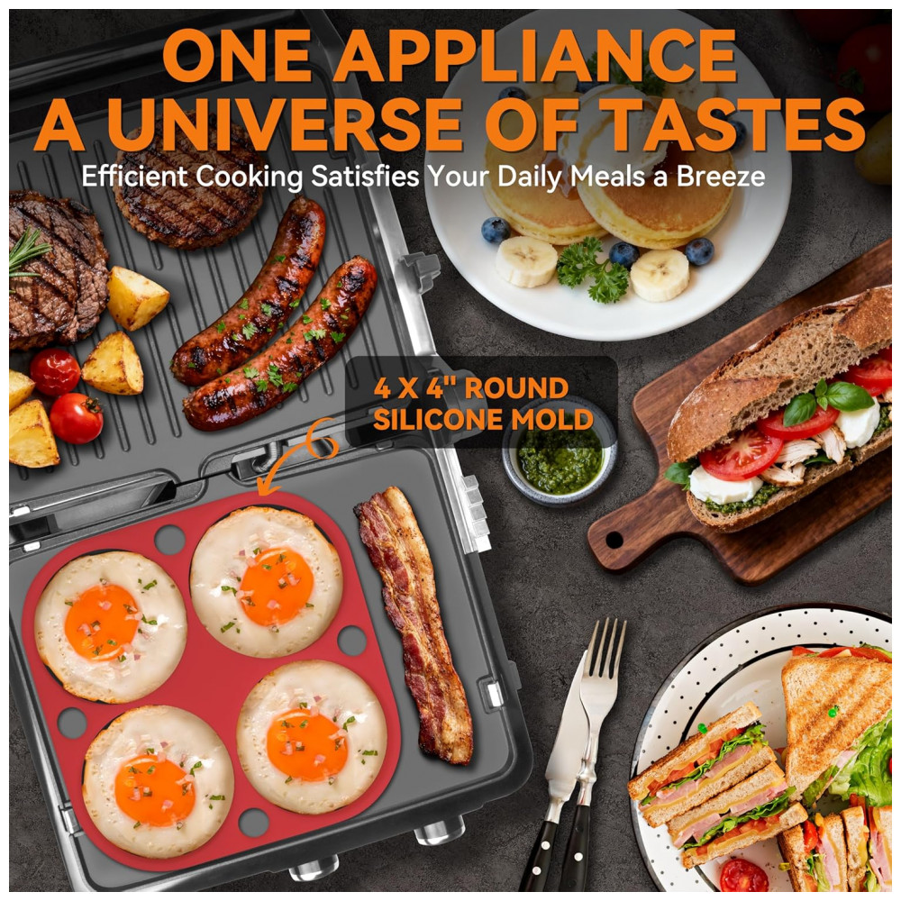 Tecnologia de aquecimento dual-zone mantém placa superior em temperatura ligeiramente inferior à inferior, selando sucos de carnes rapidamente para crosta externa e interior macio. Placas reversíveis incluem molde de silicone 4-circle para preparos estruturados.