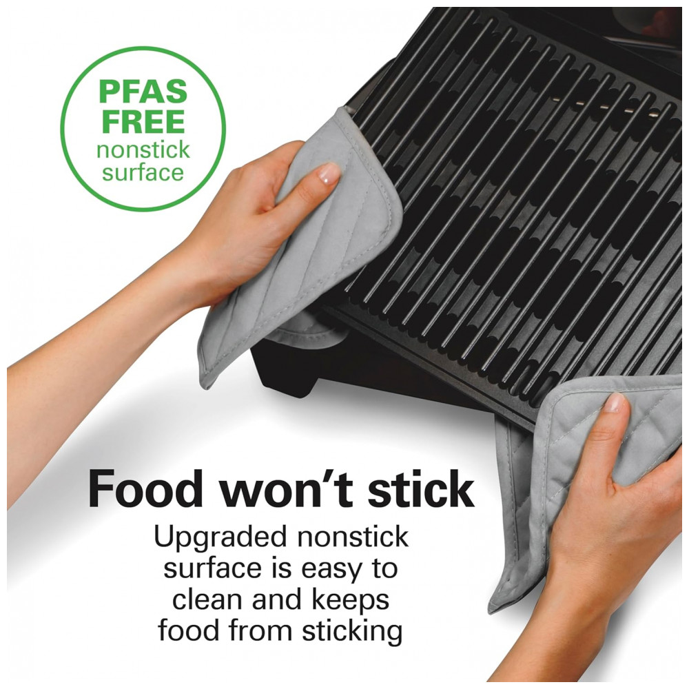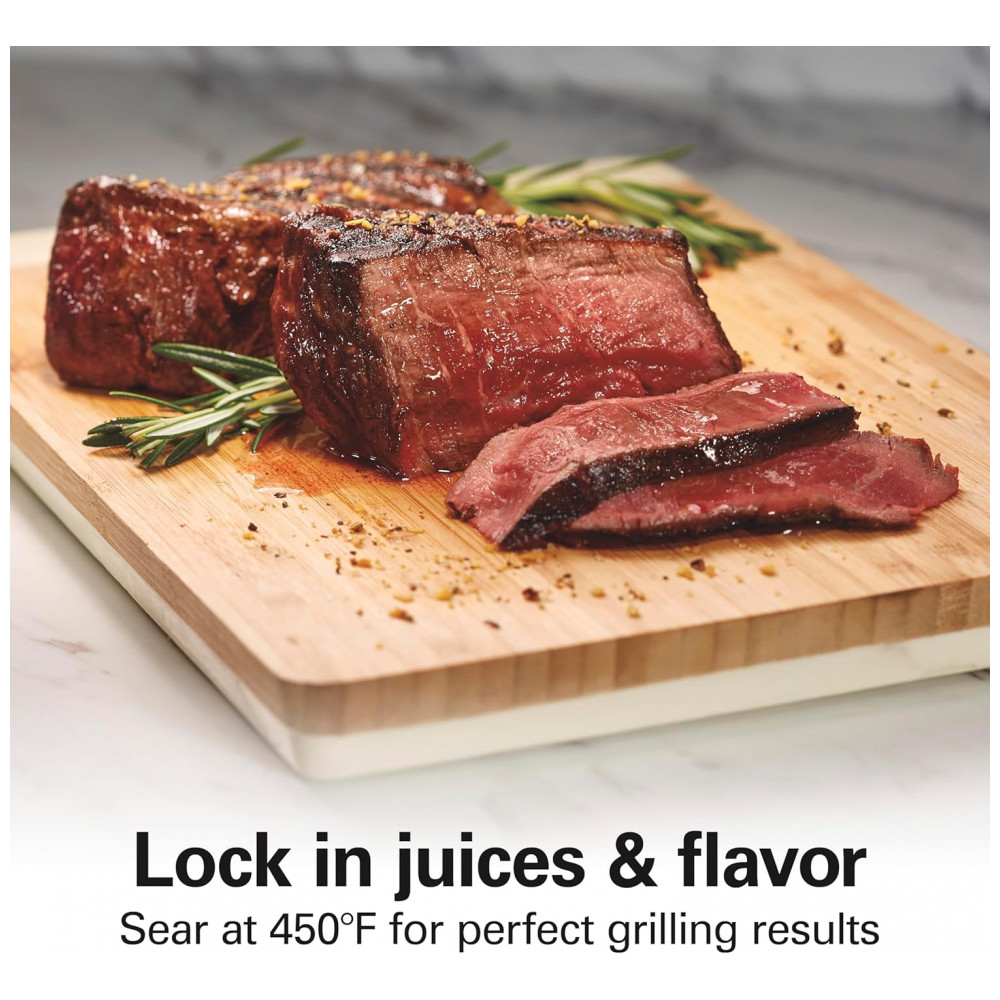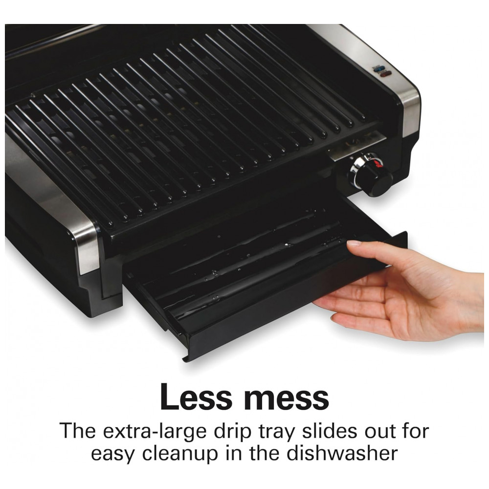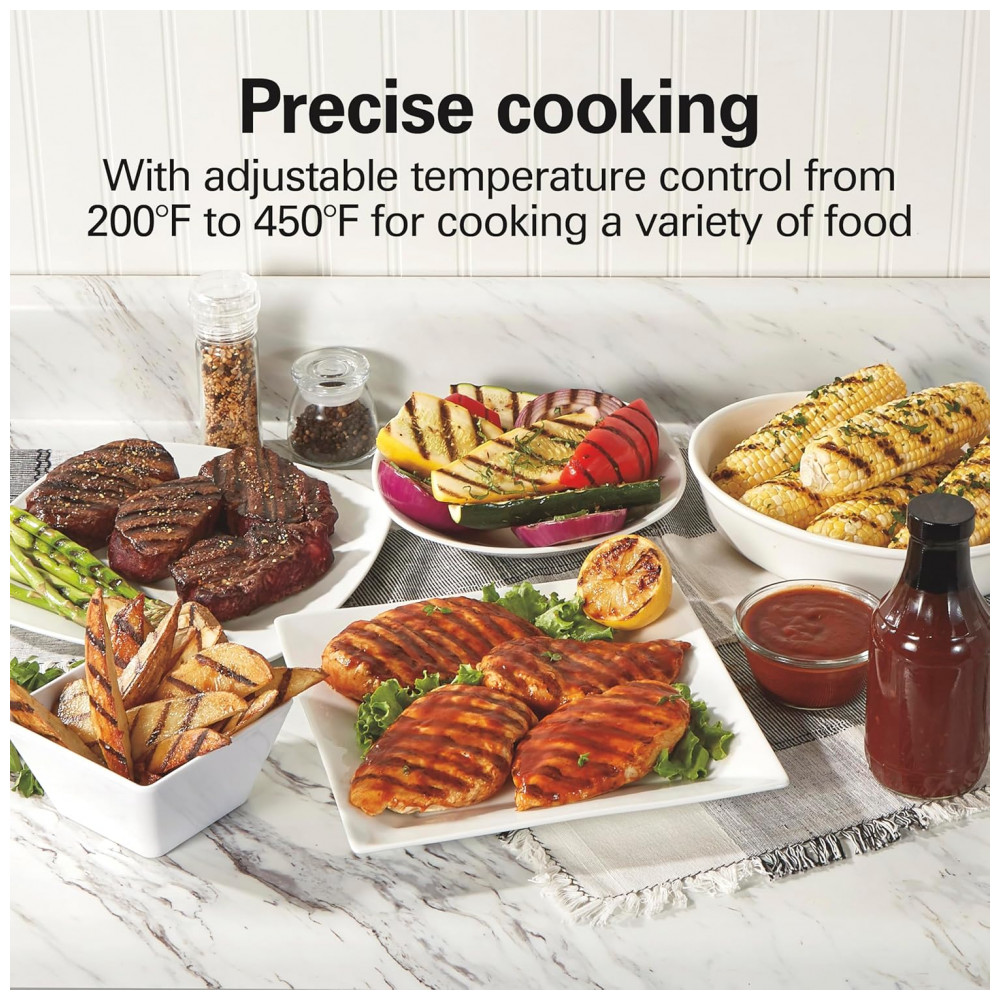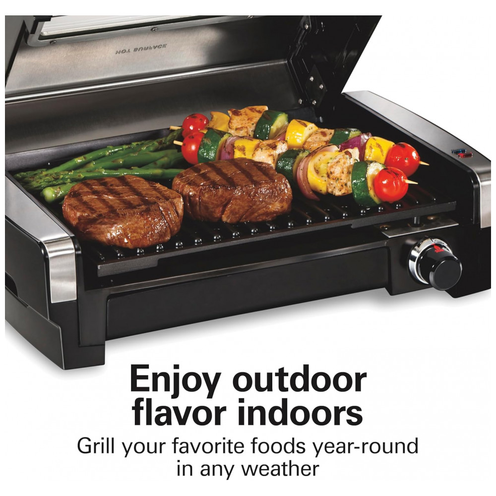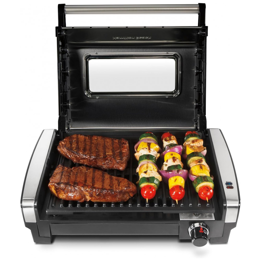 Nome do estilo Searing Grill com janela Hamilton Beach Indoor Grill torna uma brisa saudável grelhados em casa. Ajuste de temperatura, pratos próprios para máquina de lavar louça e bandeja coletora O controle de temperatura ajustável varia de 200 graus a alta temperatura de queimadura de 450 graus
