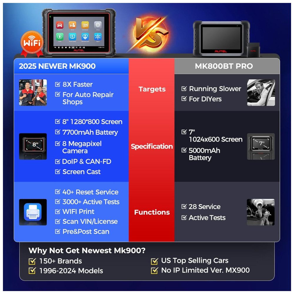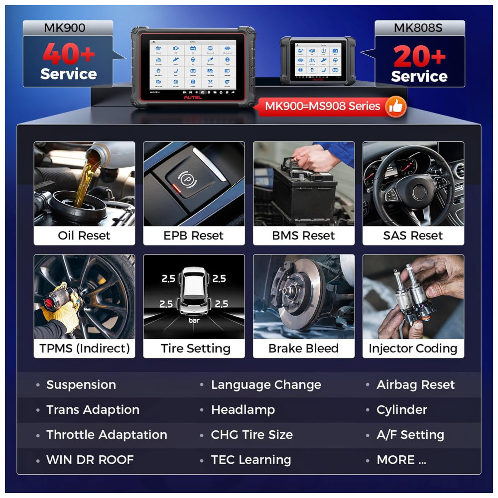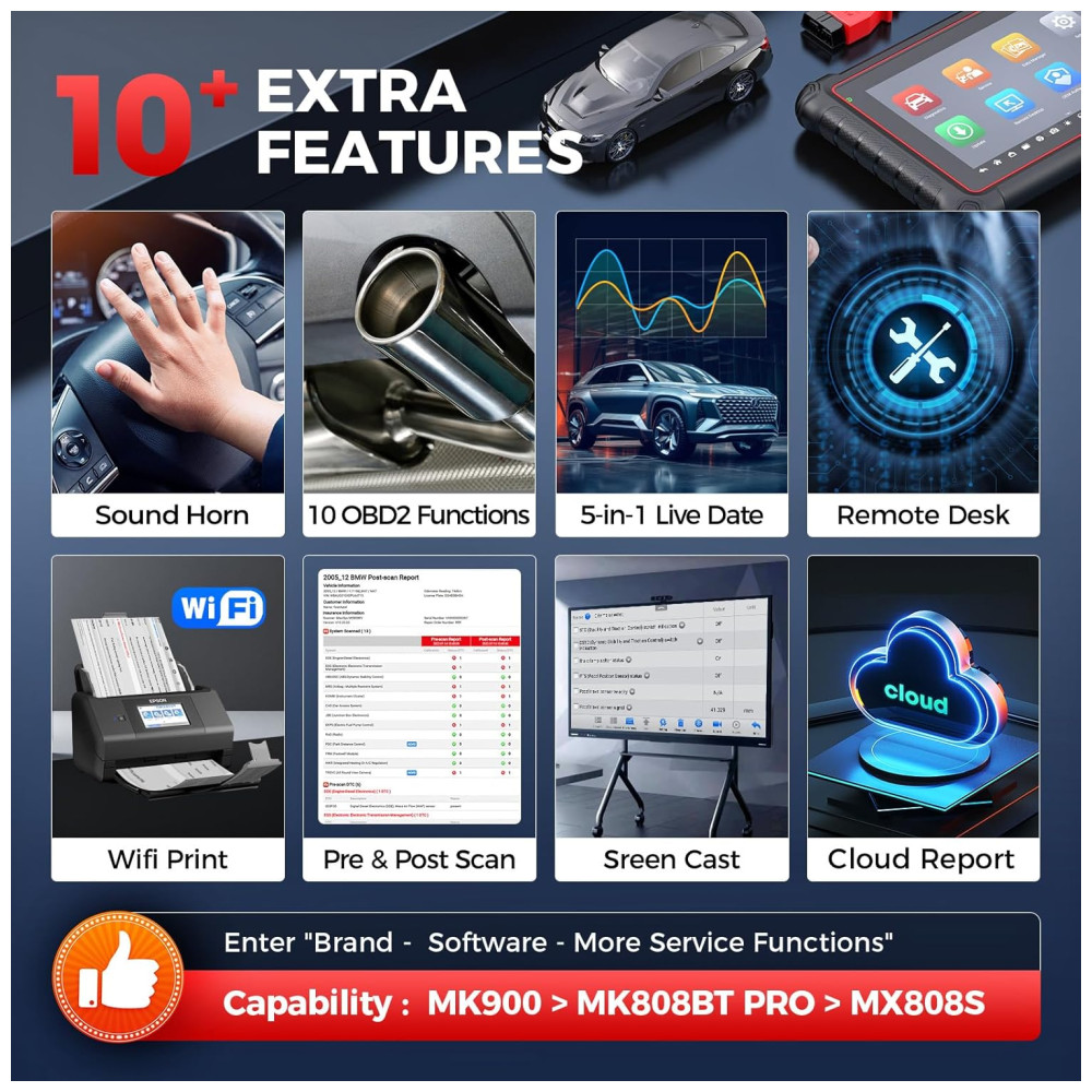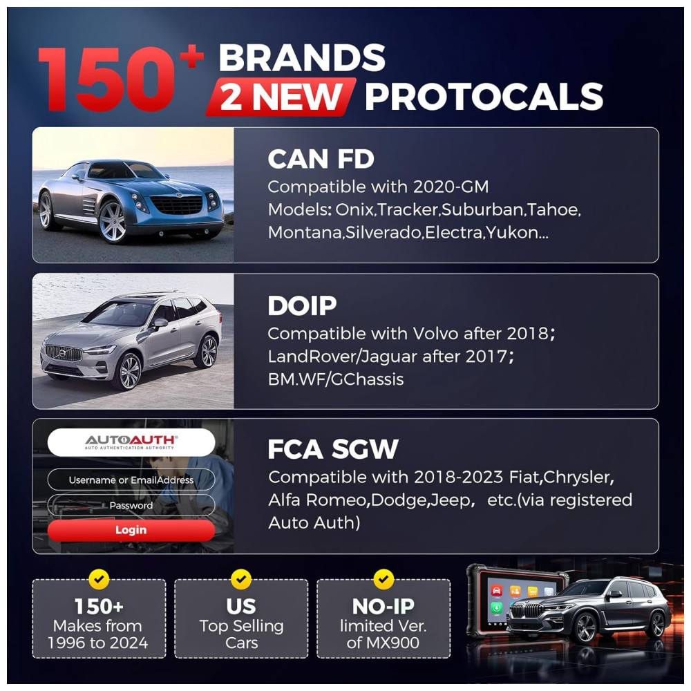 Entre as marcas compatíveis estão praticamente todas as principais fabricantes globais, incluindo veículos com protocolos modernos e funções avançadas, como FCA AutoAuth para veículos Fiat Chrysler a partir de 2018. O MK900BT realiza mais de 3000 testes ativos, 40+ serviços de manutenção (reset de óleo, sangramento de freio, calibração, etc.), controle bidirecional, codificação ECU e testes avançados.