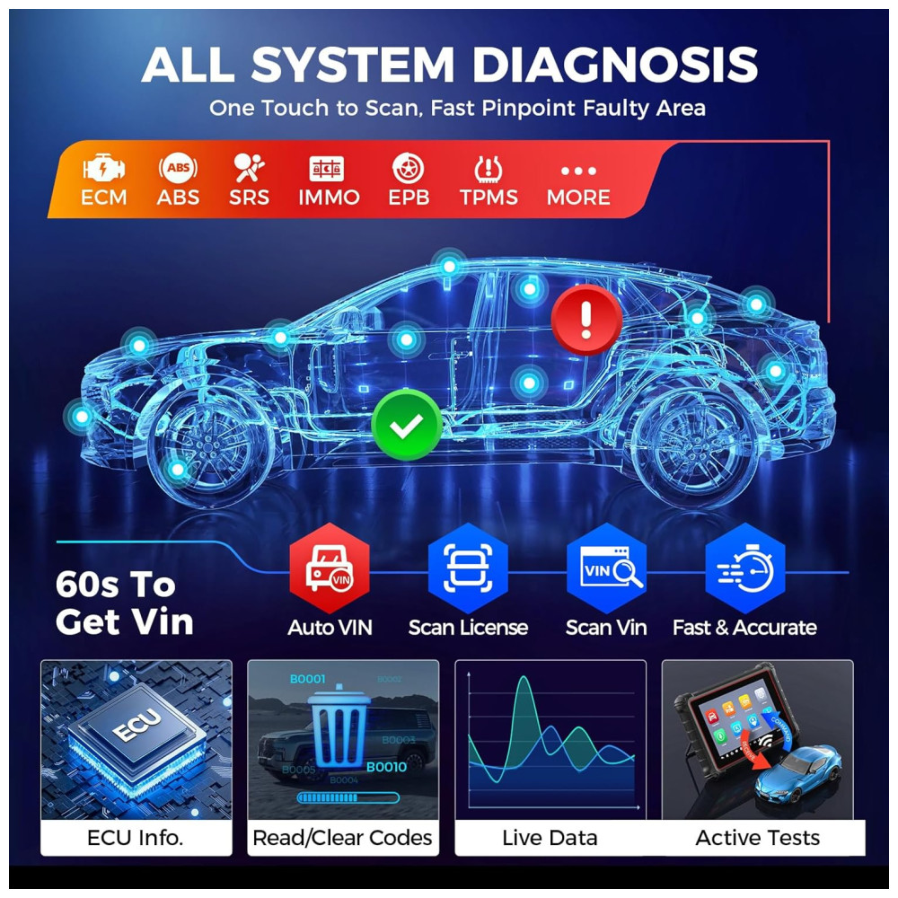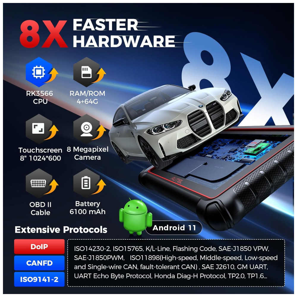 Além disso, o scanner oferece recursos como AutoVIN para identificação automática do veículo, conectividade sem fio via Bluetooth e Wi-Fi, tela touchscreen de 8 polegadas, sistema Android 11, e bateria de longa duração.