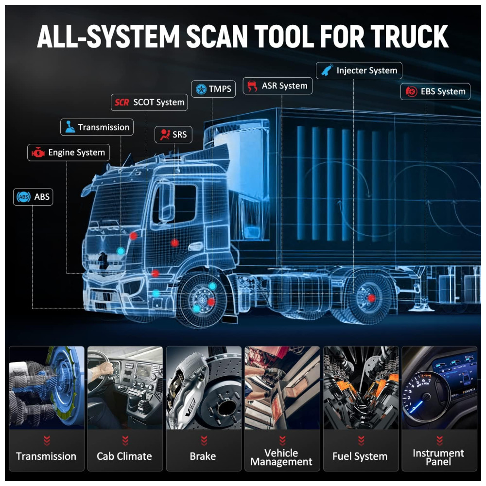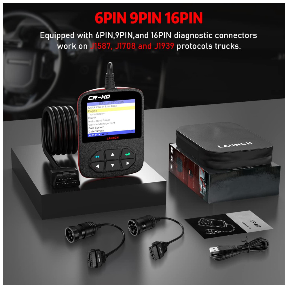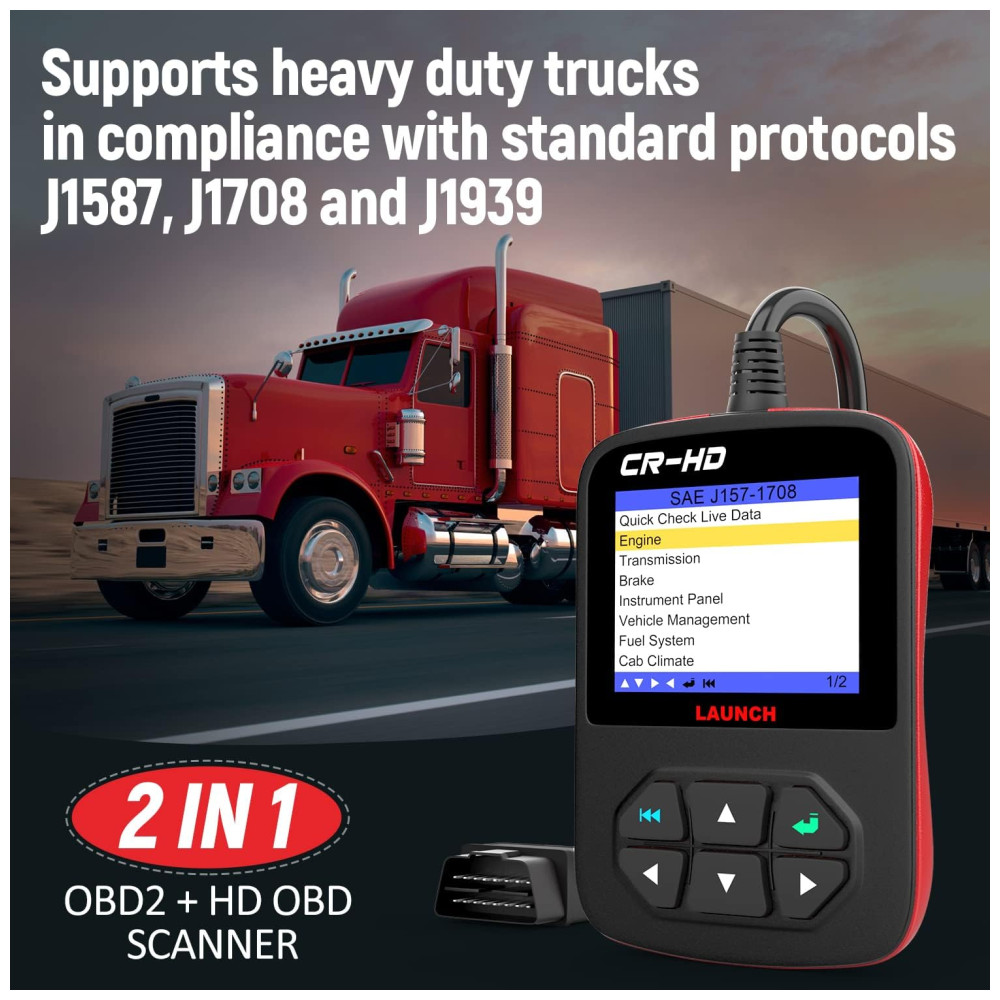 HDOBD OBDII LAUNCH CR HD ferramenta de varredura profissional de caminhão pesado funcionará em caminhões com protocolos J1587, J1708 e J1939. Abrange caminhões pesados da classe 4 14.001 libras até a classe 8 33.000 libras e mais. Ele não funciona apenas em caminhões pesados, mas também em 1996 nos EUA, 2000 na UE e 2005 na Ásia, caminhões leves somente 12V e veículos domésticos ou de importação OBD II e CAN mais s.