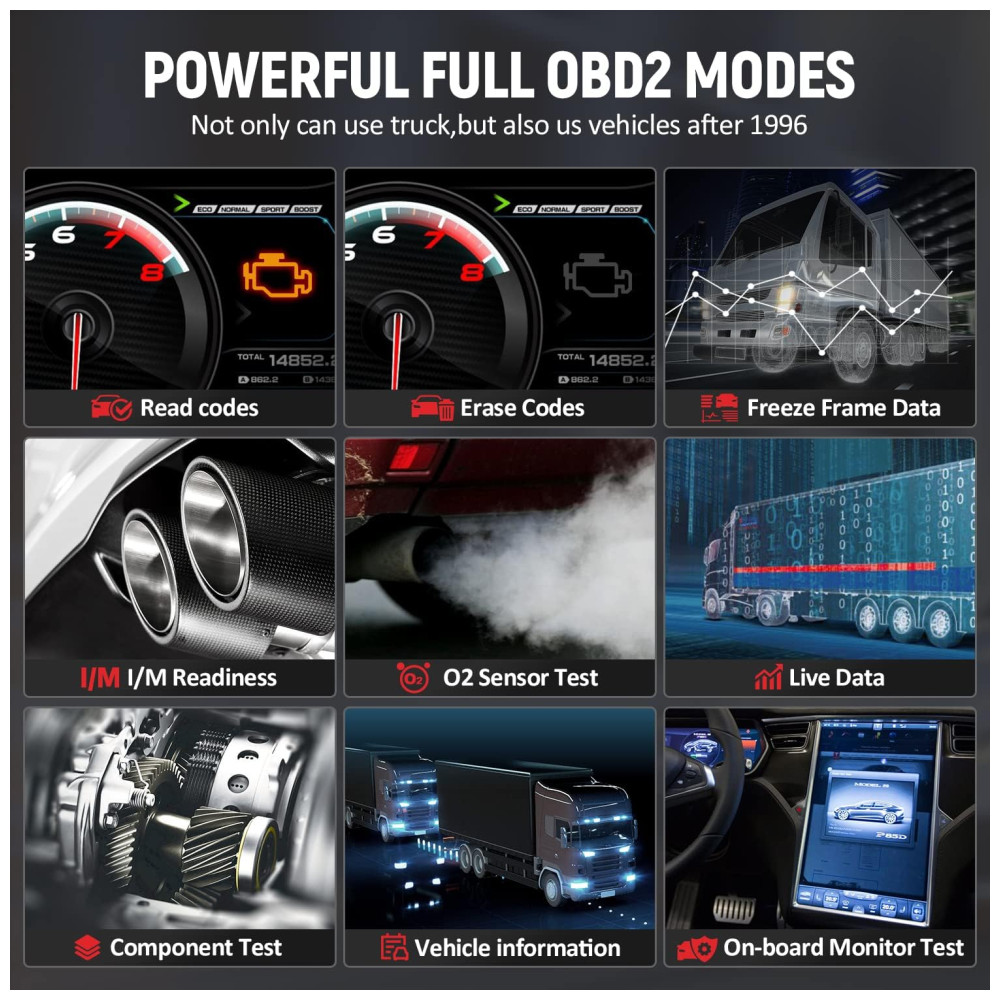 Diagnóstico multissistema Este leitor de código de caminhão HDOBD irá ler ou limpar códigos de falha no motor, transmissão, freio, painel de instrumentos, gerenciamento de veículo, sistema de combustível, clima da cabine e unidade de controle de partículas, mostrar os dados ao vivo em texto e gráfico.