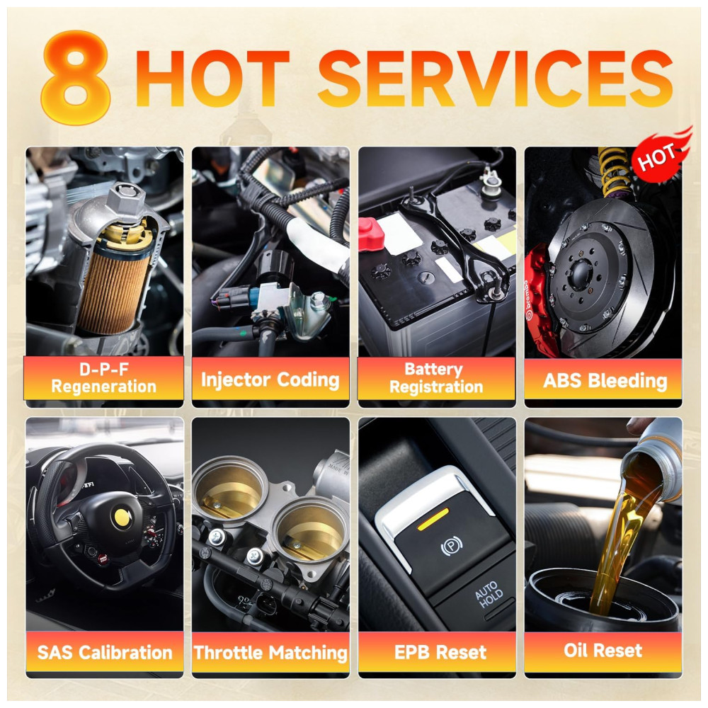 Manutenção do freio de estacionamento eletrônico e redefinição da luz de óleo A ferramenta de verificação automática profissional NT624elite fornece as funções de manutenção mais comumente usadas, Redefinição da luz de óleo para 49 marcas de automóveis, serviço de Freio de estacionamento eletrônico EPB para 42 marcas de automóveis. Realizar serviço e manutenção, incluindo luz de óleo de redefinição, desativação e ativação do sistema de controle de freio, sangramento do fluido de freio, abertura e fechamento das pastilhas de freio e configuração dos freios após a substituição do disco ou pastilha, etc.