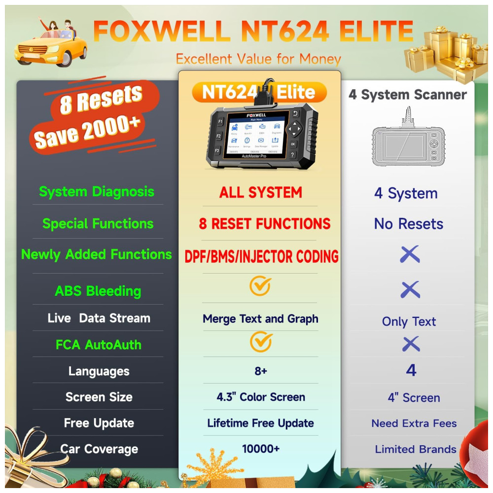 Comparado com NT604elite, O que faz a atualização do NT624Elite 1. Adicionado mais software de diagnóstico do sistema, além dos sistemas Motor , ABS , SRS , TCM, como Chassis , SAS , DPF , TPS , ESP , Suspensão , Farol , HVAC , IMMO , SAS … Que ajudam você a encontrar seus problemas de carro de forma eficiente. 2. Adicionadas duas redefinições de serviço, redefinição de luz de óleo e redefinição de serviço EPB. Tudo isso torna este NT624Elite uma ferramenta de digitalização profissional com recursos que você normalmente encontra em scanners automáticos que custam mais de 500.