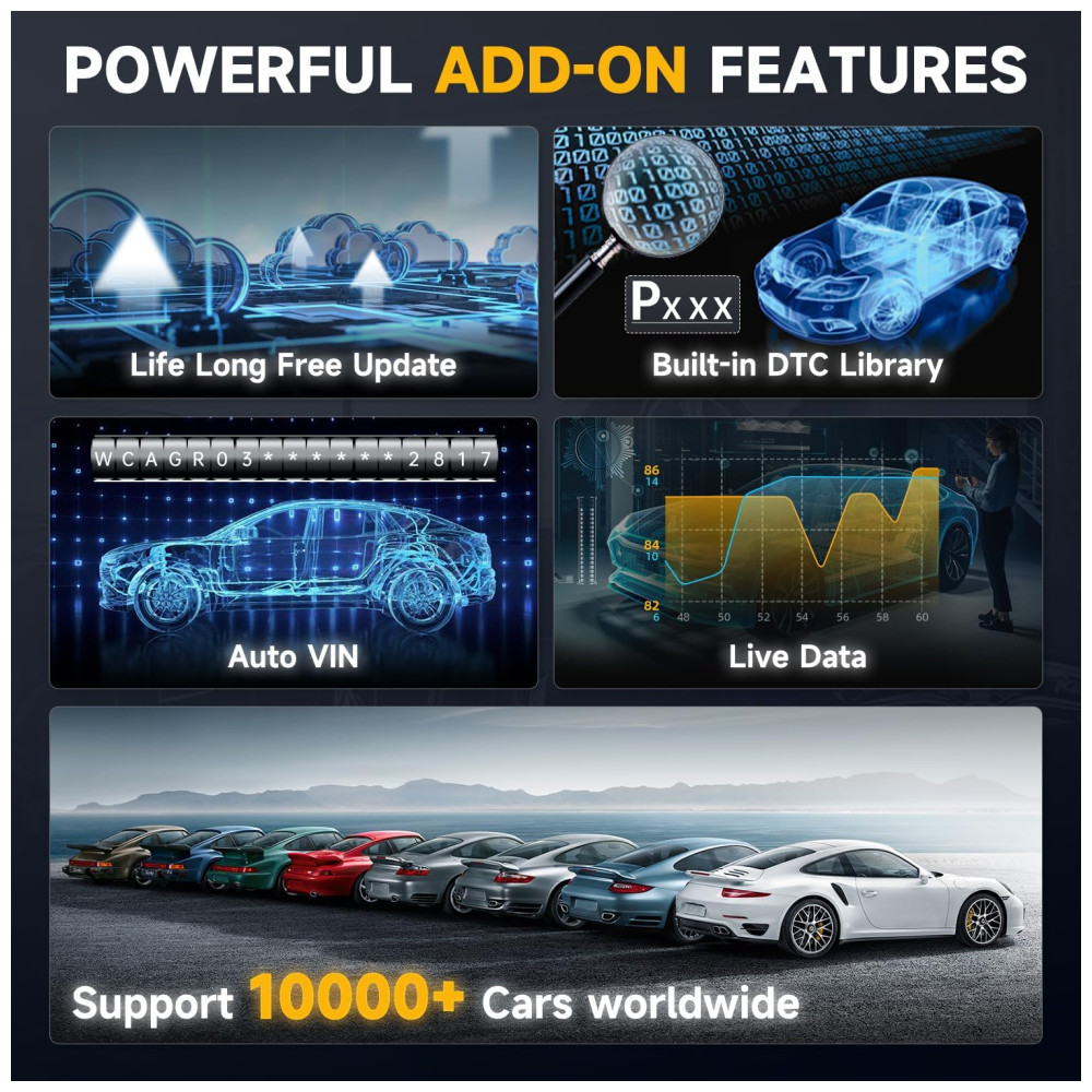 Cobrir toneladas de dados de sensores Equipado com função de diagnóstico para todos os módulos de controle eletrônico, isso significa que você será capaz de diagnosticar, ler, visualizar toneladas de dados de sensores e limpar todos os códigos de falha, incluindo ABS, SRS, airbag, verificar motor, controle de transmissão e luz de painel que acende, o que permite identificar problemas de carros de forma rápida e fácil. Claro, os códigos de problemas só podem ser apagados depois que você conserta os problemas em seu carro.