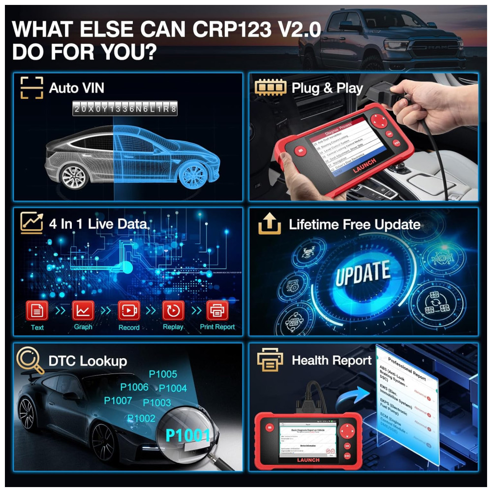 Gráfico de dados ao vivo Dados de impressão Dados de registro Fluxo de dados pesquisa DTC Lance crp123 para ler e analisar dados por meio de gráficos de dados ao vivo, ler fluxo de dados e congelar dados, registrar histórico de dados, biblioteca DTC e muito mais. Ele vem com tela de para uma exibição clara. A função de atualização gratuita estende sua vida útil e o mantém em condições precisas