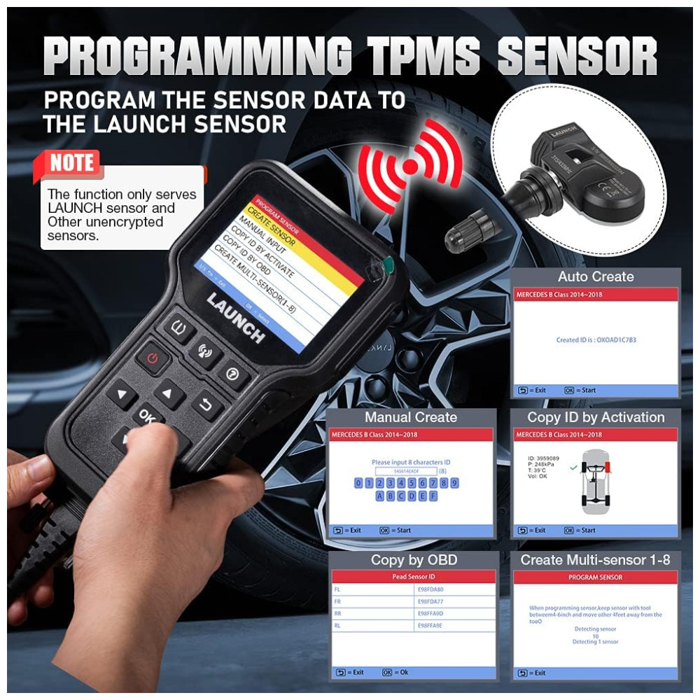 Programação de repetição ilimitada A ferramenta de programação LAUNCH CRT5011E tpms suporta criação automática simples e rápida, criação manual, ID de cópia OBD, ID de cópia ativa e criação de múltiplos sensores até 8, dados de sensor de programa para SENSOR LTR 01 de LAUNCH e substituir o a vida da bateria está baixa ou não funciona corretamente Sensor. Nota Este recurso está disponível apenas para o Sensor LAUNCH LTR 01 e outros sensores não criptografados