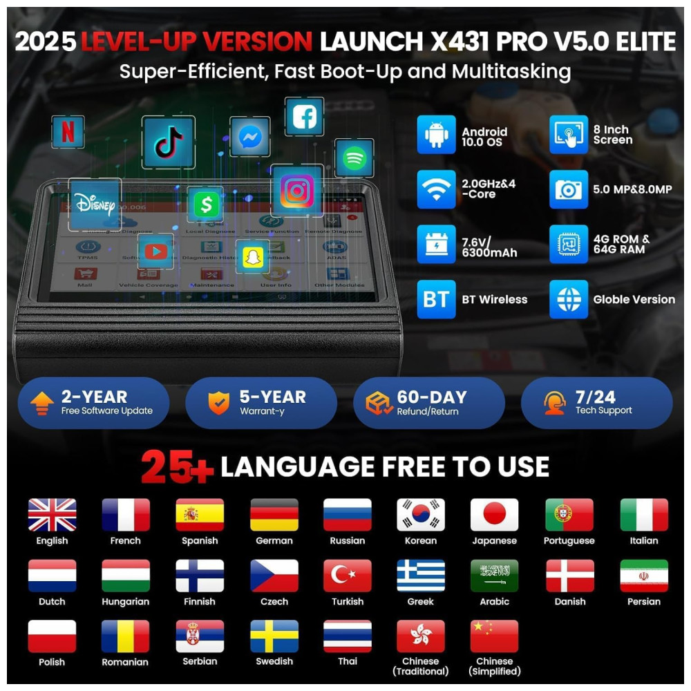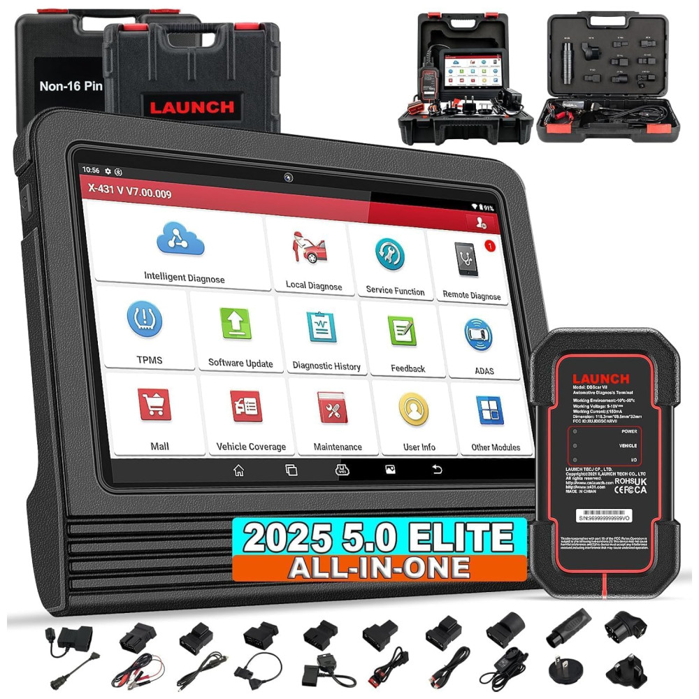 O Scanner LAUNCH X431 Pro V5.0 Elite se tornou a escolha número um de mais de 200.000 mecânicos, com o Upgrade DBScar VII VCI. Suporta CANFD DOIP, 38 Funções Especiais e 4000 Testes Ativos. Com hardware 10 vezes mais rápido do que nunca, conector DBScar VII, tela com resolução de 1280×800, WiFi dual de 2.4GHz e 5GHz, bateria de 6300mAh, 4GB de RAM, 64GB de armazenamento, processador de 2.0 GHz 4-core, AUTO VIN em 8X, câmera de 5.0 MP e 8.0 MP. Realiza Codificação Online Bidirecional, mais de 38 Serviços de Reset, Testes Ativos, Adaptação, Inicialização e Correspondência. Com mais de 100 funções especiais disponíveis. O LAUNCH X431 V5.0 é o scanner sem fio bidirecional mais rentável para oficinas e entusiastas de automóveis.