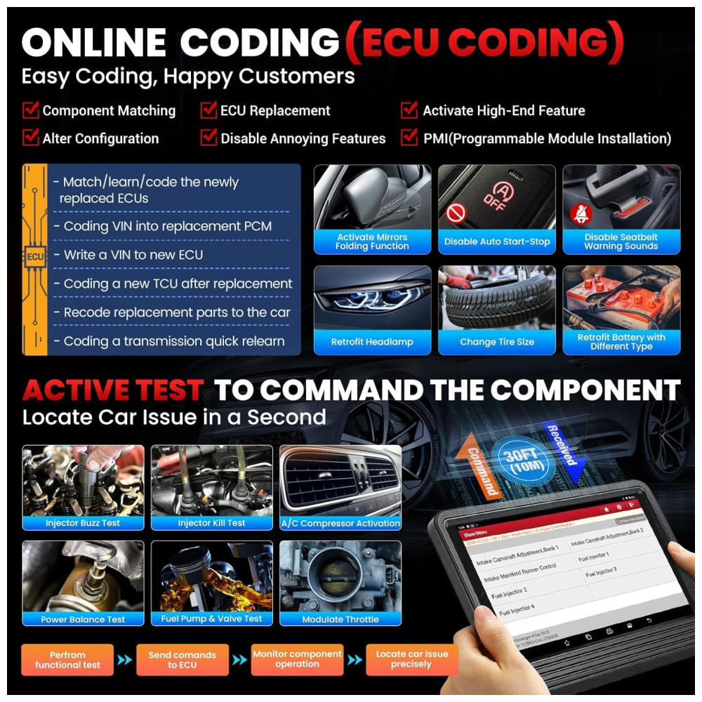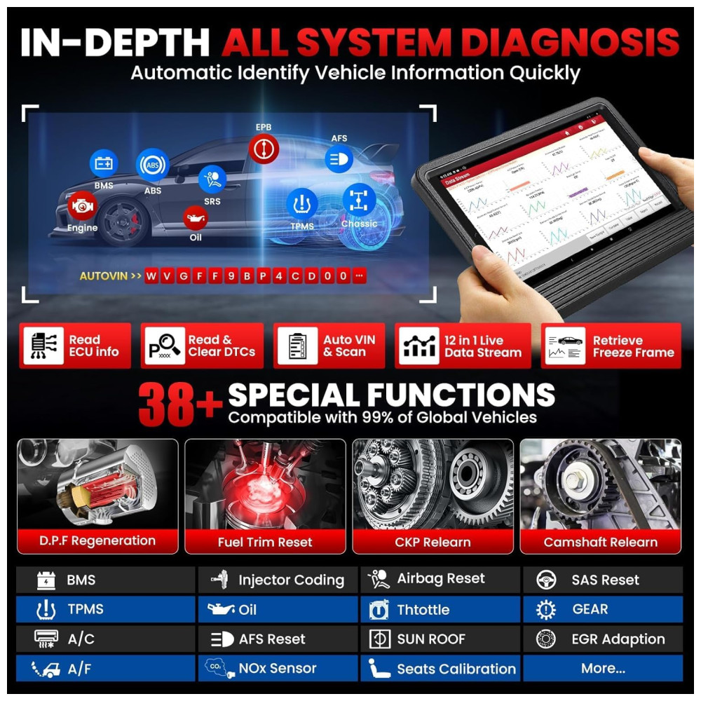 Características Especiais: VCI Bluetooth Novo DBSCAR VII atualizado, Velocidade de diagnóstico 10 vezes mais rápida + Taxa de atualização de dados ao vivo 10 vezes mais rápida. Sistema operacional Android 10.0 de código aberto para inicialização rápida e multitarefa. Memória 4GB+64GB (expansível para 128GB).