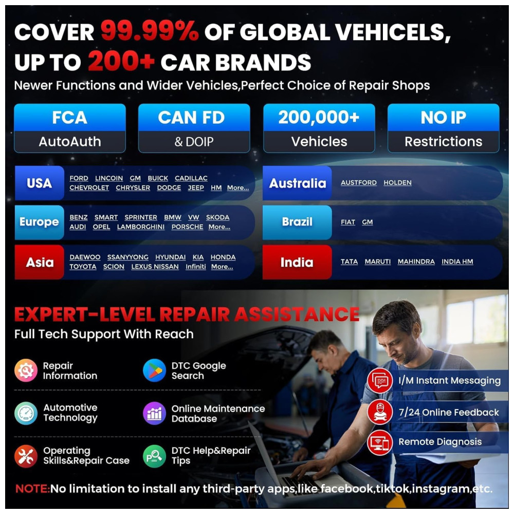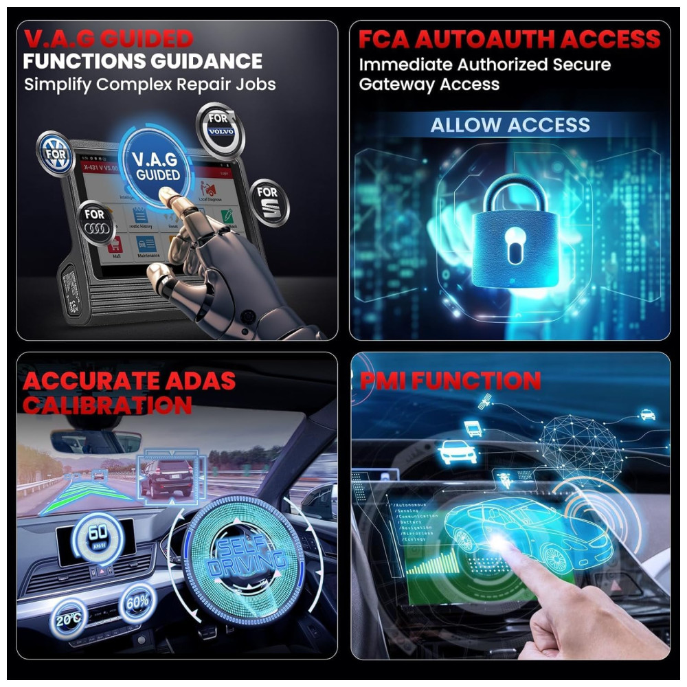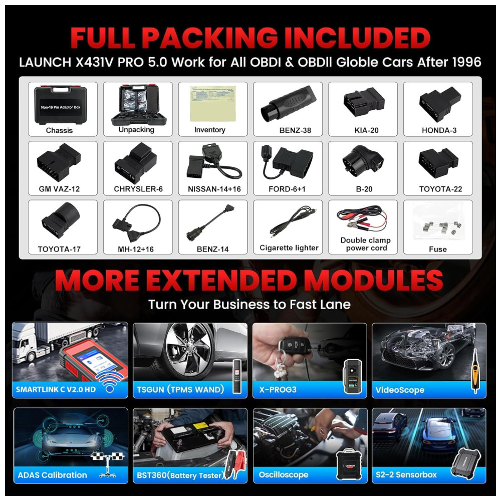 O dispositivo também permite calibração ADAS para sistemas avançados de assistência ao motorista, como ACC e AEB, ampliando a compatibilidade com veículos que possuem essas tecnologias. Em geral, o X431 V Pro 5.0 Elite cobre praticamente todos os carros modernos, incluindo veículos leves e pesados, com suporte para mais de 150 marcas globais, abrangendo desde veículos asiáticos, europeus até americanos.