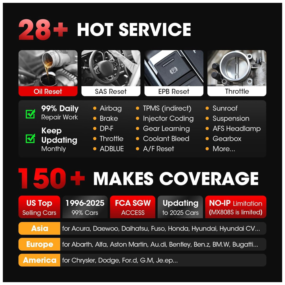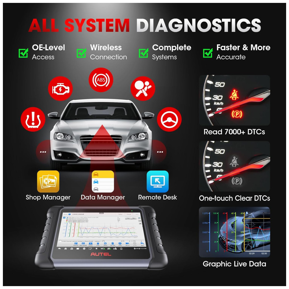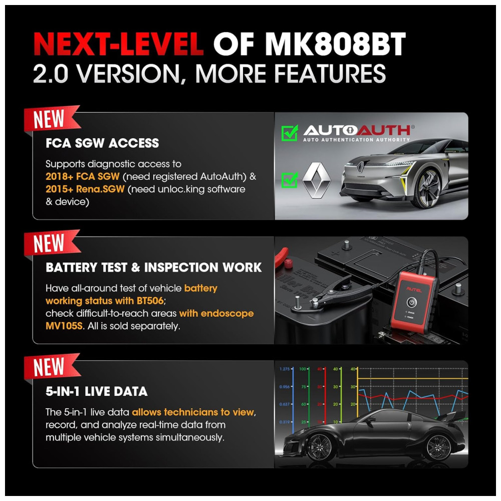 DIAGNÓSTICO E ANÁLISE AVANÇADOS Contém recursos completos para códigos, dados ativos, teste ativo, informações da ECU, adaptação e correspondência. FUNÇÕES PODEROSAS O DS808 inclui as funções de serviço mais comumente executadas, como Serviço de Redefinição de Óleo, Serviço de Programação TPMS, Serviço EPB, Serviço de Regeneração DPF, Serviço de Calibração SAS, Serviço de Calibração SAS, Serviço ABS , SRS etc. FUNÇÕES ESPECIALIZADAS O Autel DS808 inclui o AutoVIN inteligente, MaxiFix baseado em nuvem e funções do Shop Manager. O DS808 cobre mais de 80 veículos dos EUA, asiáticos e europeus entre o ano de 1996 e 2017, o que inclui a cobertura excepcional do sistema de nível OE para todos os sistemas eletrônicos. ATUALIZAÇÃO AUTOMÁTICA DE SOFTWARE A Atualização automática permite que a ferramenta atualize automaticamente o SO, o sistema MaxiDAS e o veículo. Nós fornecemos um ano de atualização on line