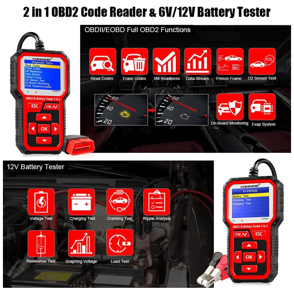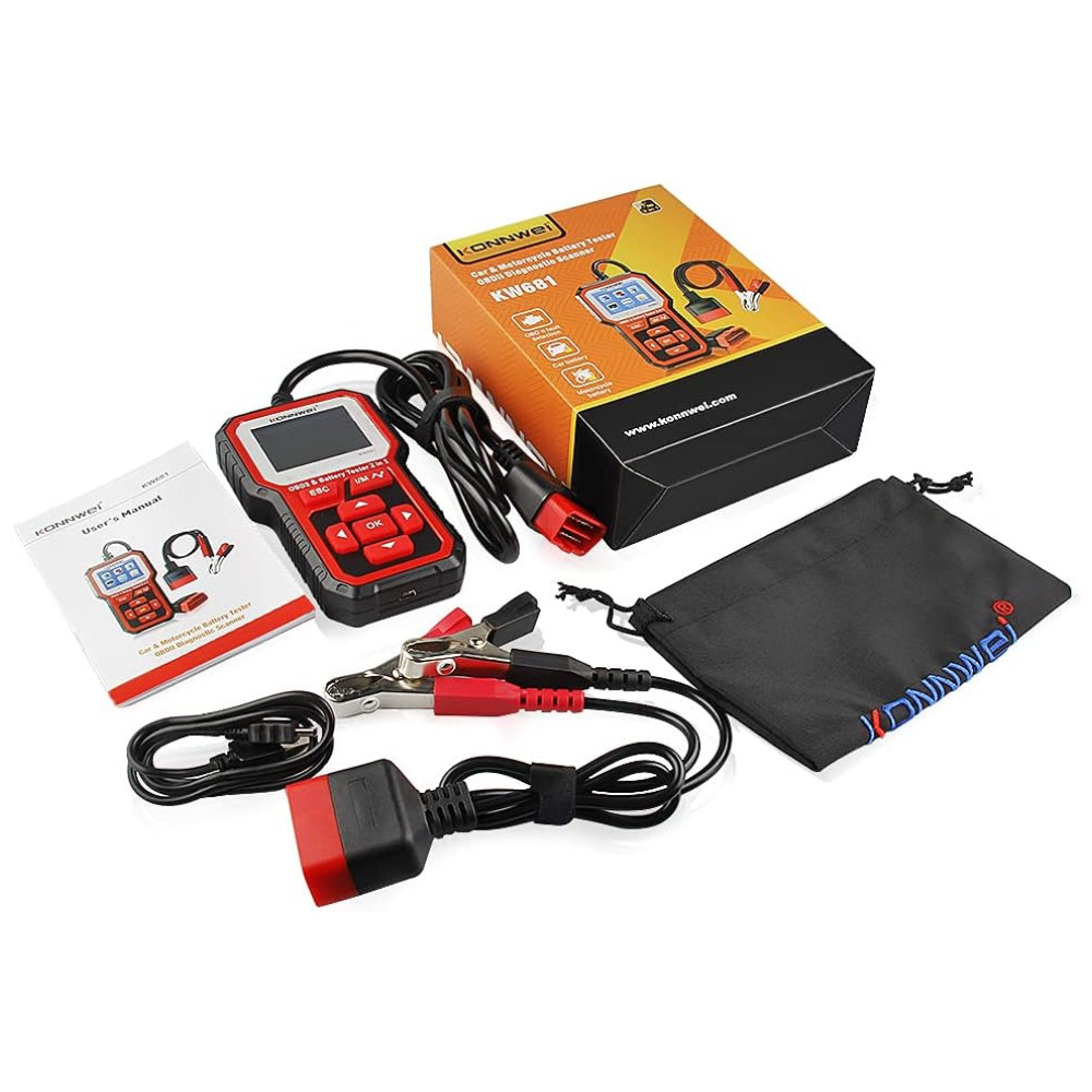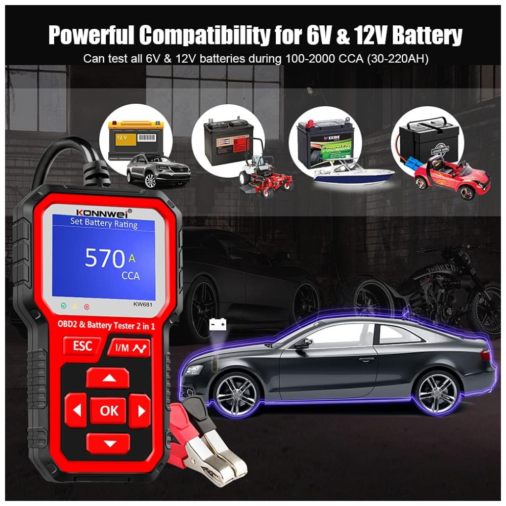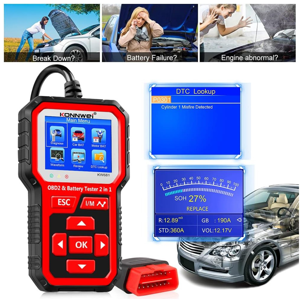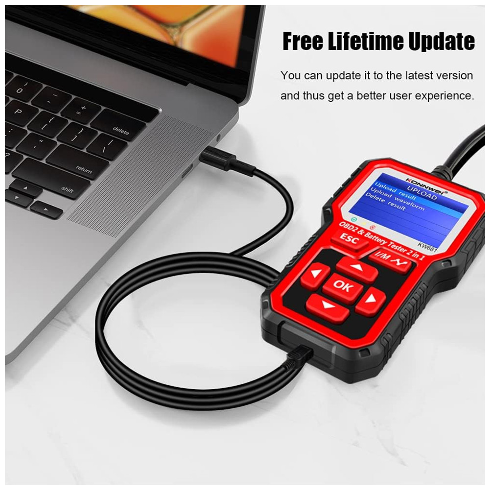 SCANNER OBD2 APRIMORADO TESTADOR DE BATERIA KONNWEI KW681 é a combinação perfeita de leitor de código de verificação de motor e testador de carga de alternador de bateria de carro de 6V e 12V. Este scanner obd2 não só pode ler dados de teste de sensor de O2 ao vivo, dados de quadro de congelamento, dados de teste de monitor on board, desligar a verificação de luz do motor MIL, limpar códigos e redefinir monitor, recuperar informações do veículo VIN, CID e CVN. Também pode fornecer uma análise geral da integridade das baterias e ajudá lo a saber seu status com antecedência antes de morrer.