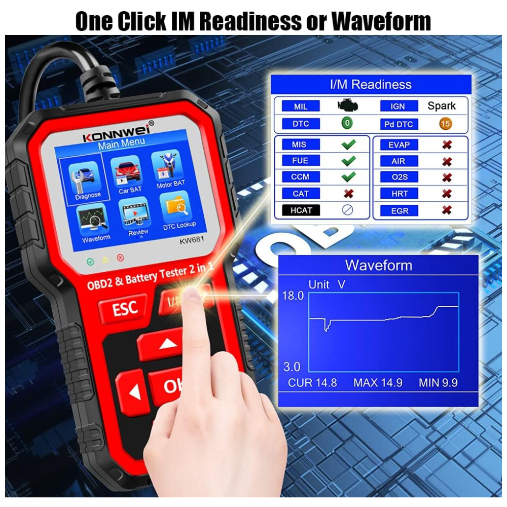 I , M REDINESS , FORMA DE ONDA DE UMA CHAVE Grande tela colorida TFT e teclas de atalho para acesso de prontidão I , M ao status de emissão e forma de onda da bateria com um clique. O indicador vermelho amarelo verde ajuda a exibir o status do carro diretamente. Leitor de código de computador para carro KW681 Funciona na maioria dos veículos domésticos e de importação mais recentes a gasolina ou diesel OBDII e CAN localizados nos EUA, incluindo automóveis de passageiros, SUVs, caminhões leves, etc