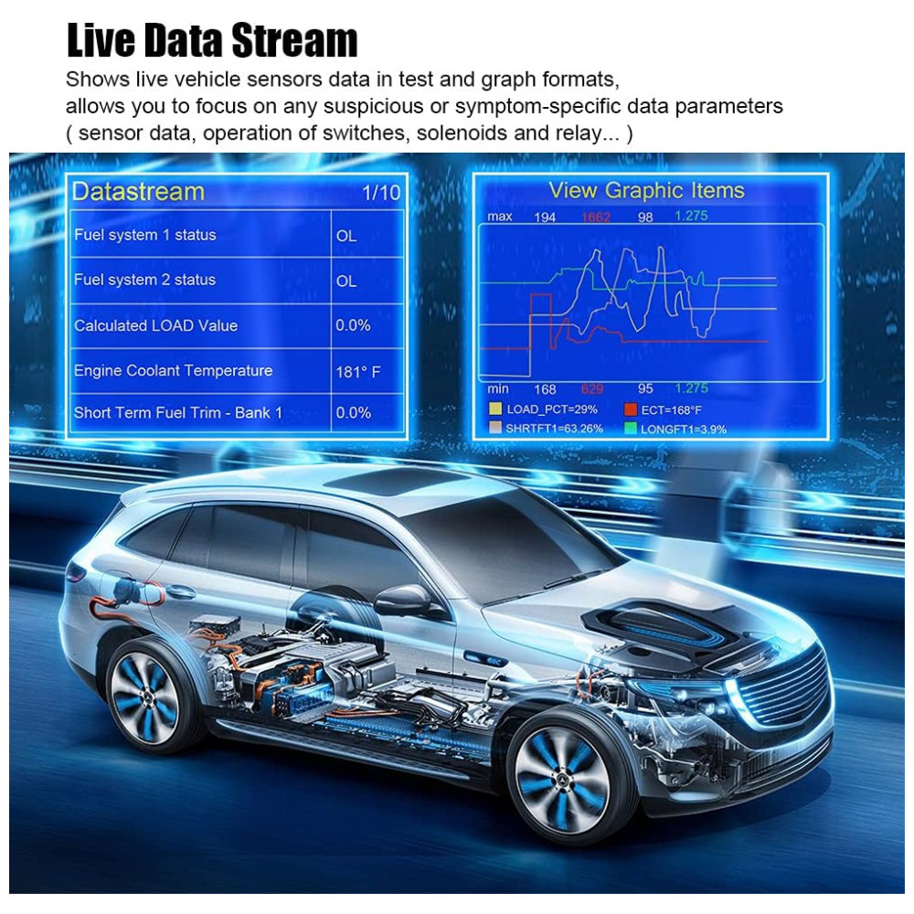EXIBIR DADOS OU TENSÃO AO VIVO EM GRÁFICOS Ferramentas de diagnóstico automotivo do scanner KW681 obd2 mostram dados de sensores de veículos ao vivo, incluindo mudança de tensão em tempo real em formatos de teste e gráfico, permite que você se concentre em quaisquer parâmetros de dados suspeitos ou específicos de sintomas e reproduza dados PID reais do módulo de controle eletrônico. Leia com precisão os códigos de erro para a maioria dos carros, SUVs, caminhões leves e diesel 12V em todo o mundo, é um scanner de diagnóstico de carro obd2 para todos os carros.