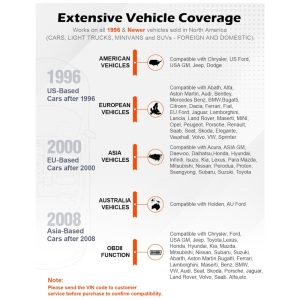 Trabalha na MAIORIA de 1996 com base nos EUA, 2000 na UE e carros asiáticos, e mais s veículos domésticos ou de importação OBD II e CAN. Suporta inglês, alemão, francês, espanhol, finlandês, holandês, russo e português.