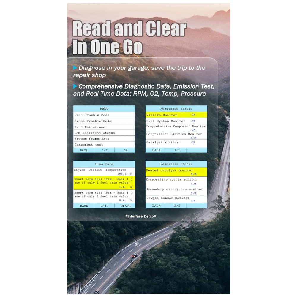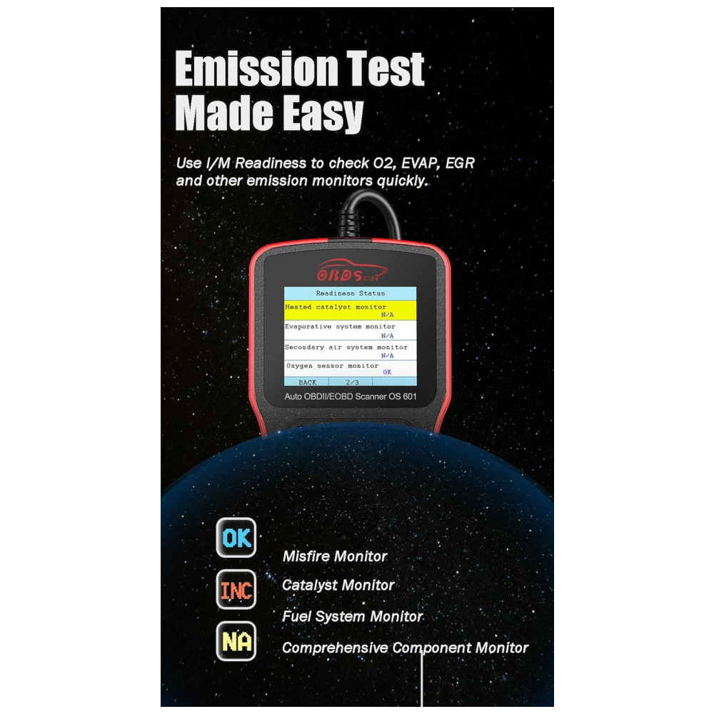 Verificação da poluição mostra claramente se os sistemas relacionados às emissões estão operando corretamente ou prontos para testes de inspeção e manutenção desliga a luz do motor de verificação e zera os monitores exibe dados de quadro congelado, lê fluxo de dados PCM ao vivo, dados de teste do sistema EVAP, dados de teste do Monitor On Board e exibe dados de teste do sensor de O2 ao vivo.