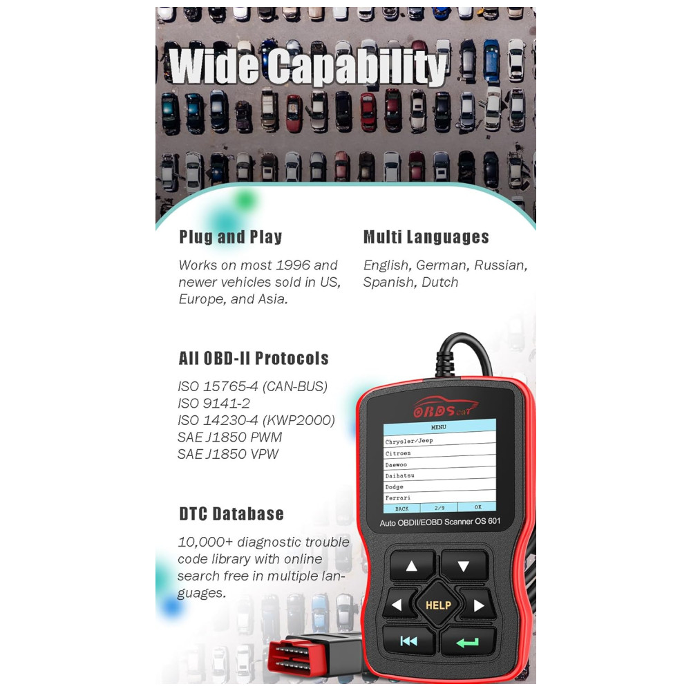 Não é necessária bateria, basta conectá la à porta OBDII e iniciar o diagnóstico. Possui um plugue flexível de e um painel de 7 botões. Suporta pesquisa DTC e atualização de software. Suporta exibição em vários idiomas inglês, alemão, espanhol, holandês, russo