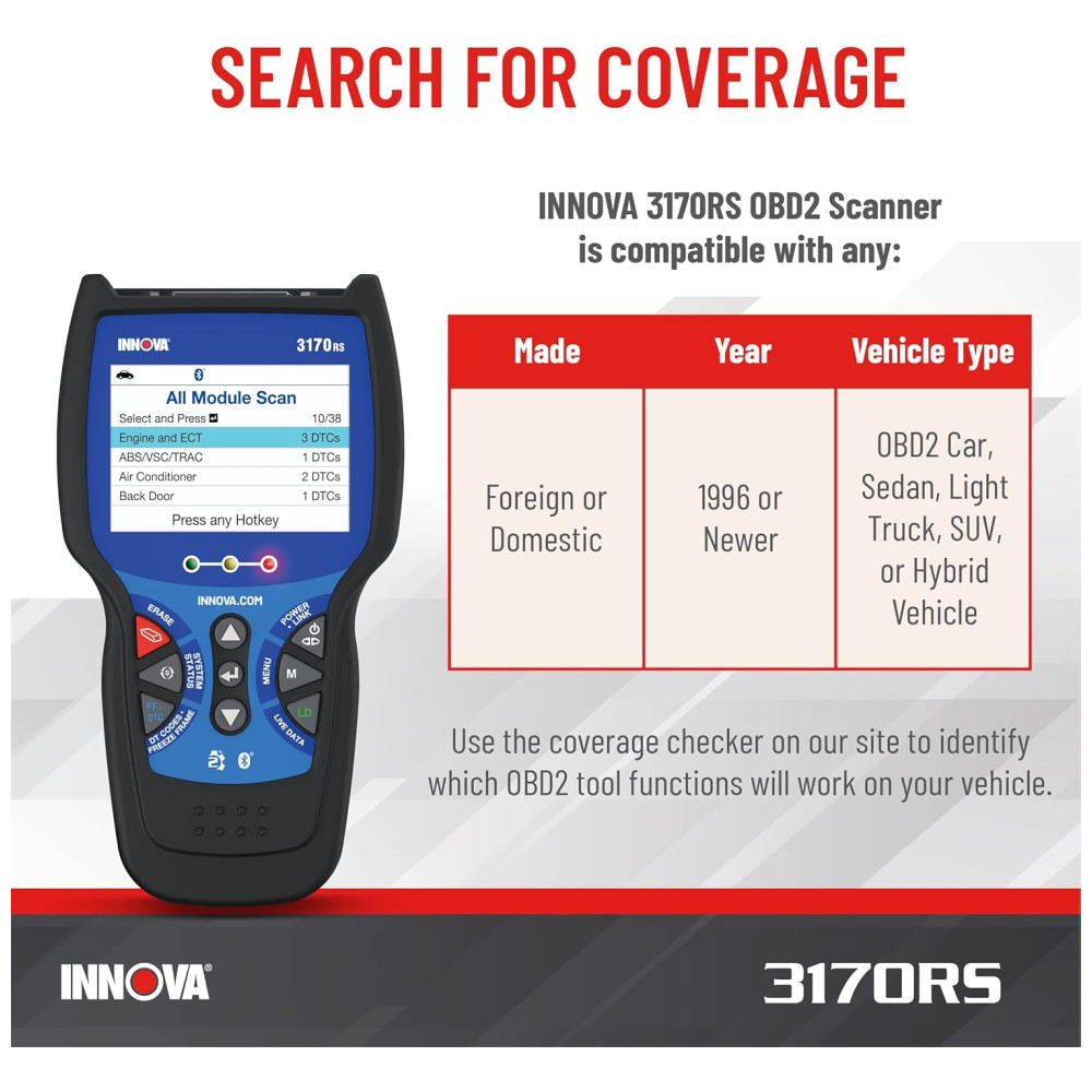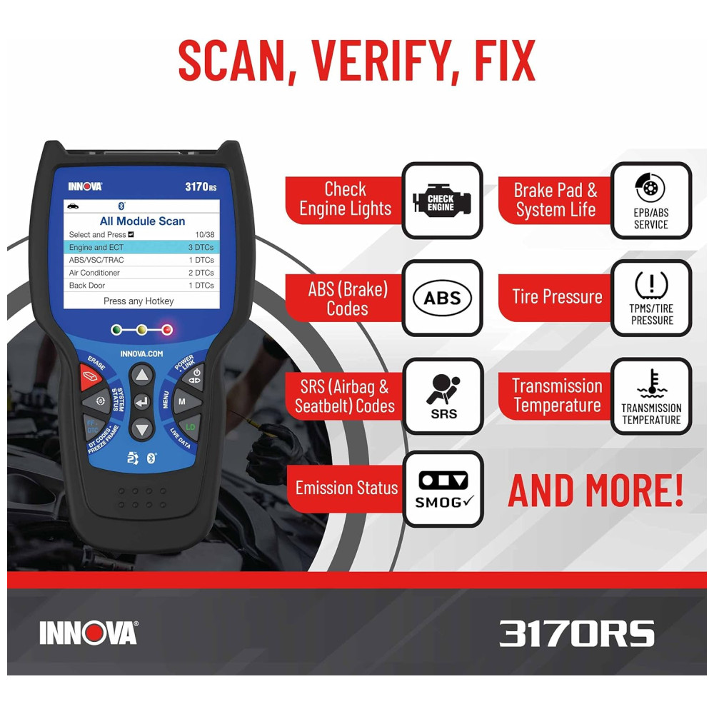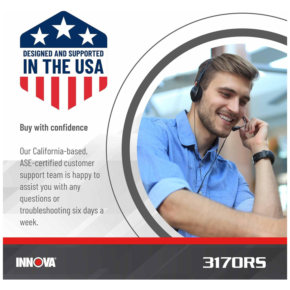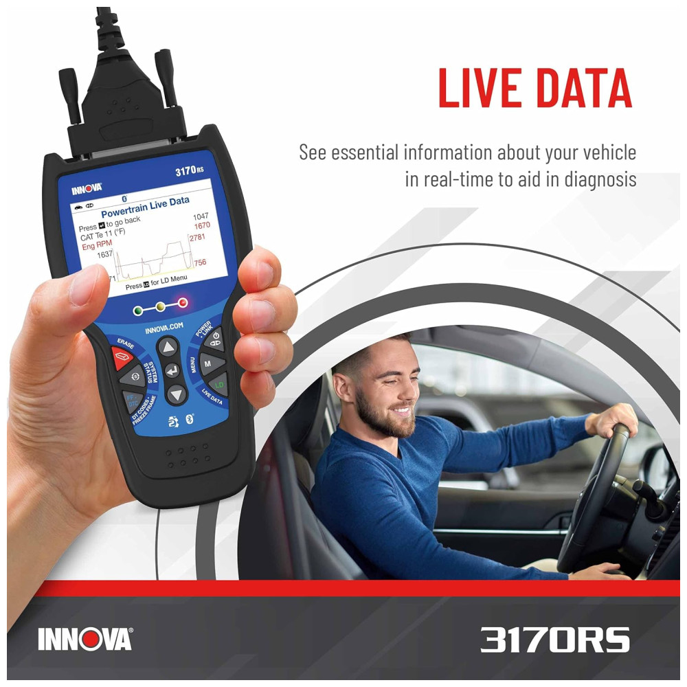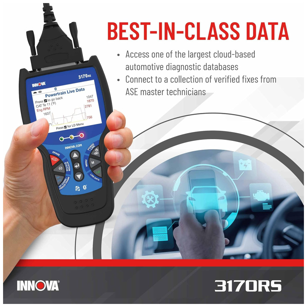 MANTENHA O DESEMPENHO E A SEGURANÇA DO PICO NA ESTRADA O scanner 3170RS OBD2 do Innova ajuda você a encontrar e resolver o problema facilmente. O aplicativo de scanner de código de carro incluído, RepairSolutions2 oferece soluções em tempo real para solucionar e corrigir seus problemas automotivos. Obtenha as correções verificadas deste scanner automotivo, encontre e compre a peça exata necessária para o reparo, veja os cronogramas de manutenção, receba boletins técnicos, recalls e acesso ao banco de dados da melhor classe do Innova.