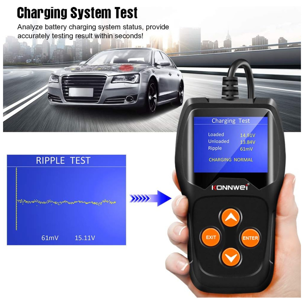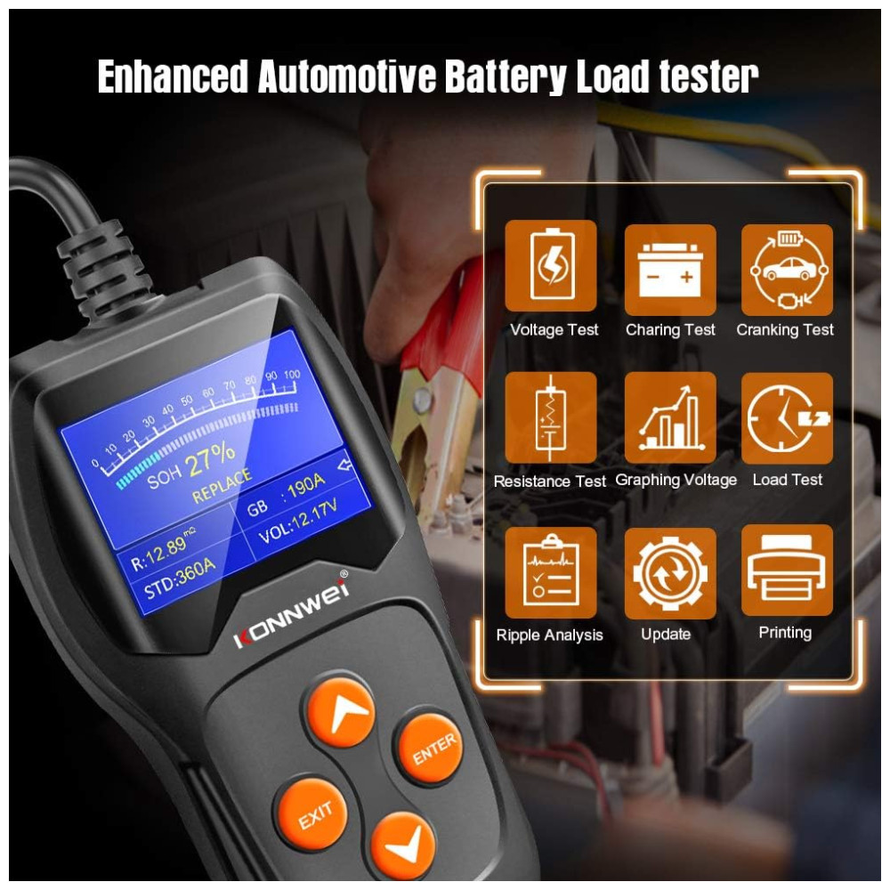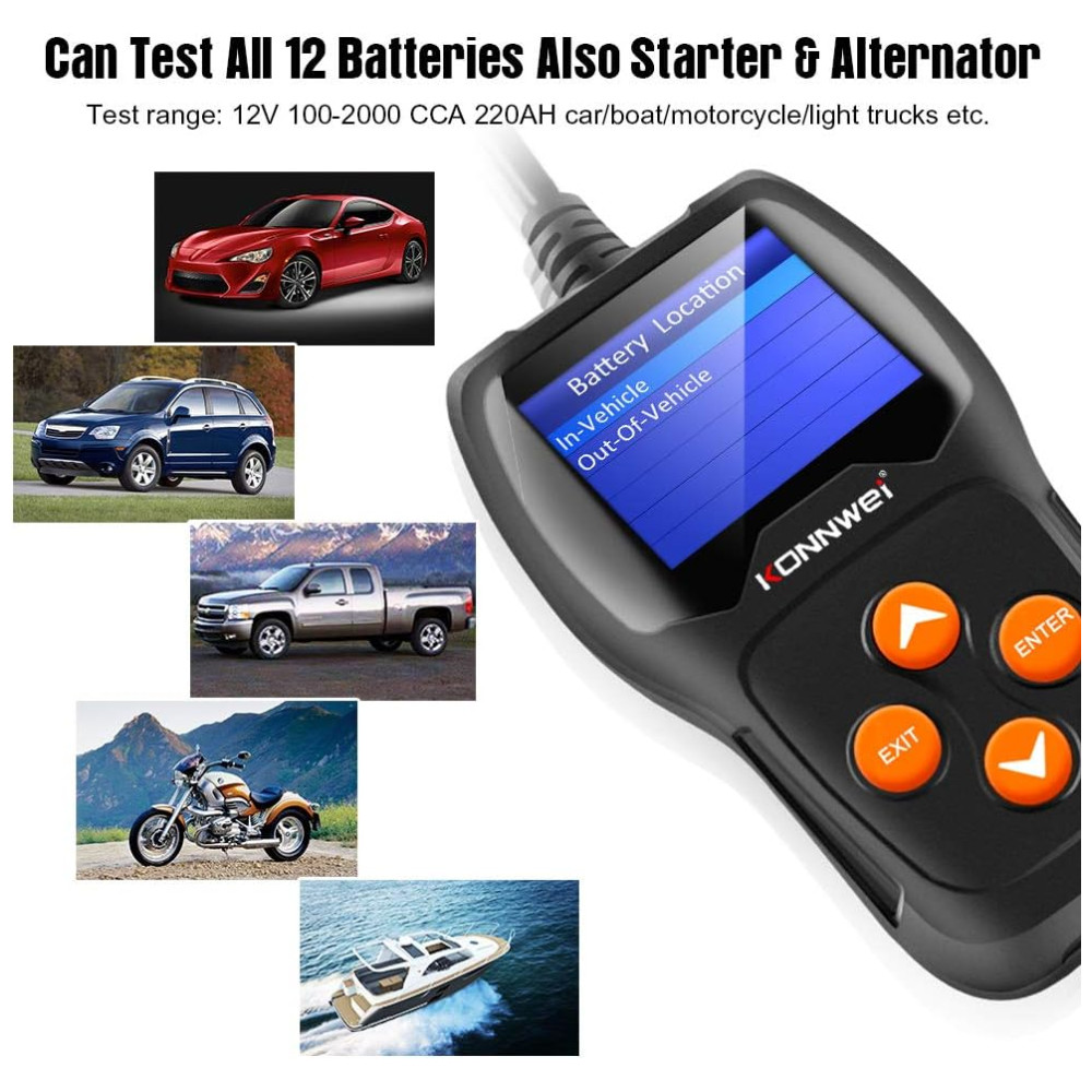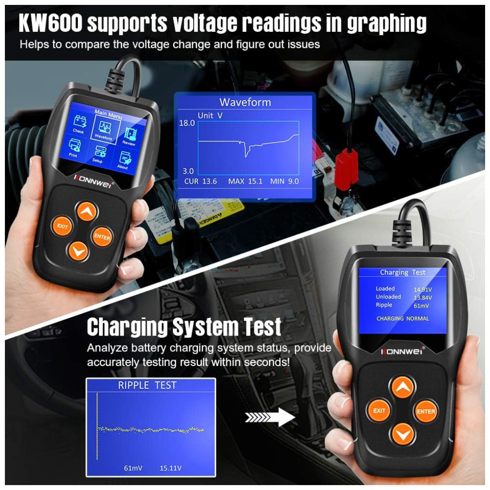 MUITO COMPATÍVEL O testador de diagnóstico de bateria de carro KW600 pode funcionar em todas as baterias 12V 100 2000CCA, incluindo baterias normais inundadas, placa plana AGM, espiral AGM, bem como baterias GEL, como carro, marinha, barco, motocicleta, baterias solares, etc. .