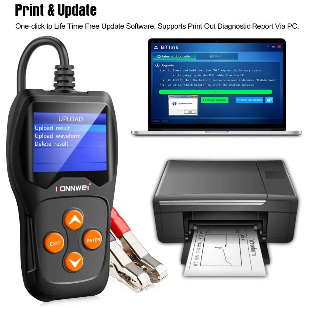 RECURSOS EXTRA O testador de carga da bateria do carro KW600 exibe os resultados do teste em texto e gráficos, também exibe a tensão da bateria em tempo real em uma forma de onda. Com uma tela LCD inteligente de e chip principal STM 32 de nível superior, é fácil de ler e tem maior velocidade Além disso, o KW600 também suporta serviço vitalício de atualização de software