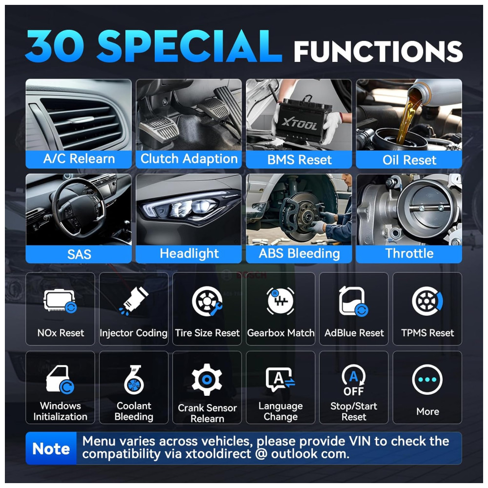Entre as marcas compatíveis estão Toyota, Ford, GM, Dodge, Jeep, Chrysler, Lexus, Honda, Acura, BMW, Mercedes-Benz, entre outras populares. O scanner oferece 30 funções de reset, incluindo reset de óleo, sangramento de ABS, reaprendizagem do sensor de posição do acelerador, EPB, entre outras.