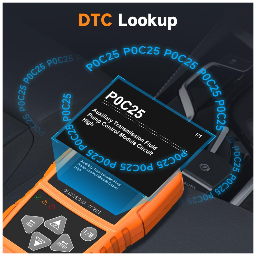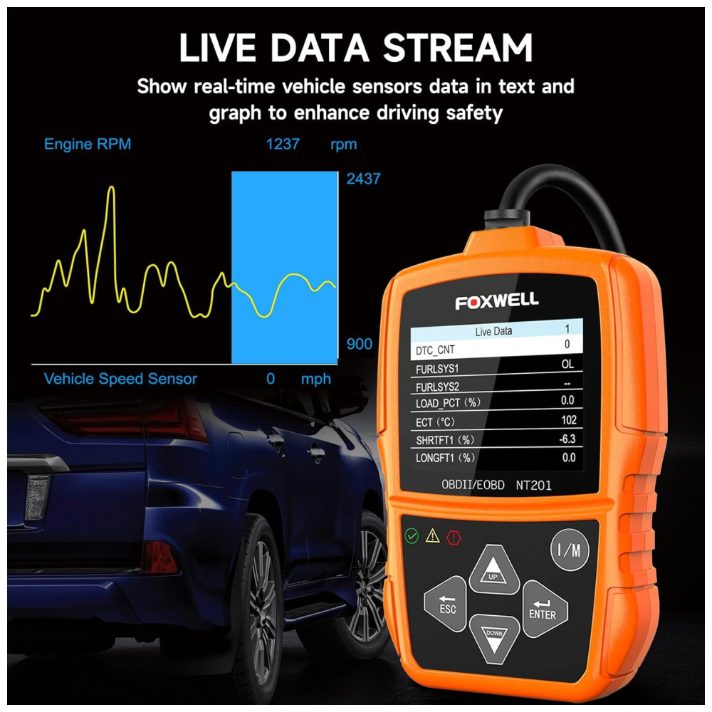 Scanner de diagnóstico OBD2 completo para 10 modos. Leia e apague códigos de falha, recupere prontidão I , M e congele dados de quadros, mostre dados ao vivo no formato de texto e gráfico, aquisição automática de VIN, sensor O2 e teste EVAP modo 8, Monitoramento avançado a bordo Modo 6. Teste do monitor de bordo. Você pode usar o scanner de carro para diagnosticar a falha de ignição e o monitoramento ao vivo de O2 para ter uma ideia de que uma falha de ignição está ocorrendo em qual banco e cilindro. Esta ferramenta de diagnóstico de carro com leitor de código representa graficamente todos os dados de streaming em tempo real que ele lê, incluindo, entre outros, temperatura do líquido de arrefecimento do motor, compensação de combustível a curto prazo, compensação de combustível a longo prazo, rotação do motor, rotação do motor, saída do sensor de oxigênio. Ampla cobertura do veículo reader. O leitor de código do mecanismo de verificação de veículo bidirecional NT201 funcionará em veículos nacionais e de importação, como caminhões leves apenas 12v, SUVs e minivan com o protocolo OBD2 , EOBD , JOBD CAN padrão. Veículos europeus de 2000, americanos de 1996 e asiáticos de 2008. DICAS O scanner OBD2 não é compatível com carros híbridos ou elétricos. O leitor de código de automóvel NT201 é construído em alto falante e 2. Tela colorida de 4 TFT LCD colorida, oferece indicação visual e audível para verificação de prontidão. A superfície resistente a poeira torna esta ferramenta de scanner automático mais forte e mais durável. Plug and play, sem necessidade de baterias, obtenha energia diretamente da interface OBD2 em seu veículo. O menu multilíngue suporta inglês, espanhol, etc