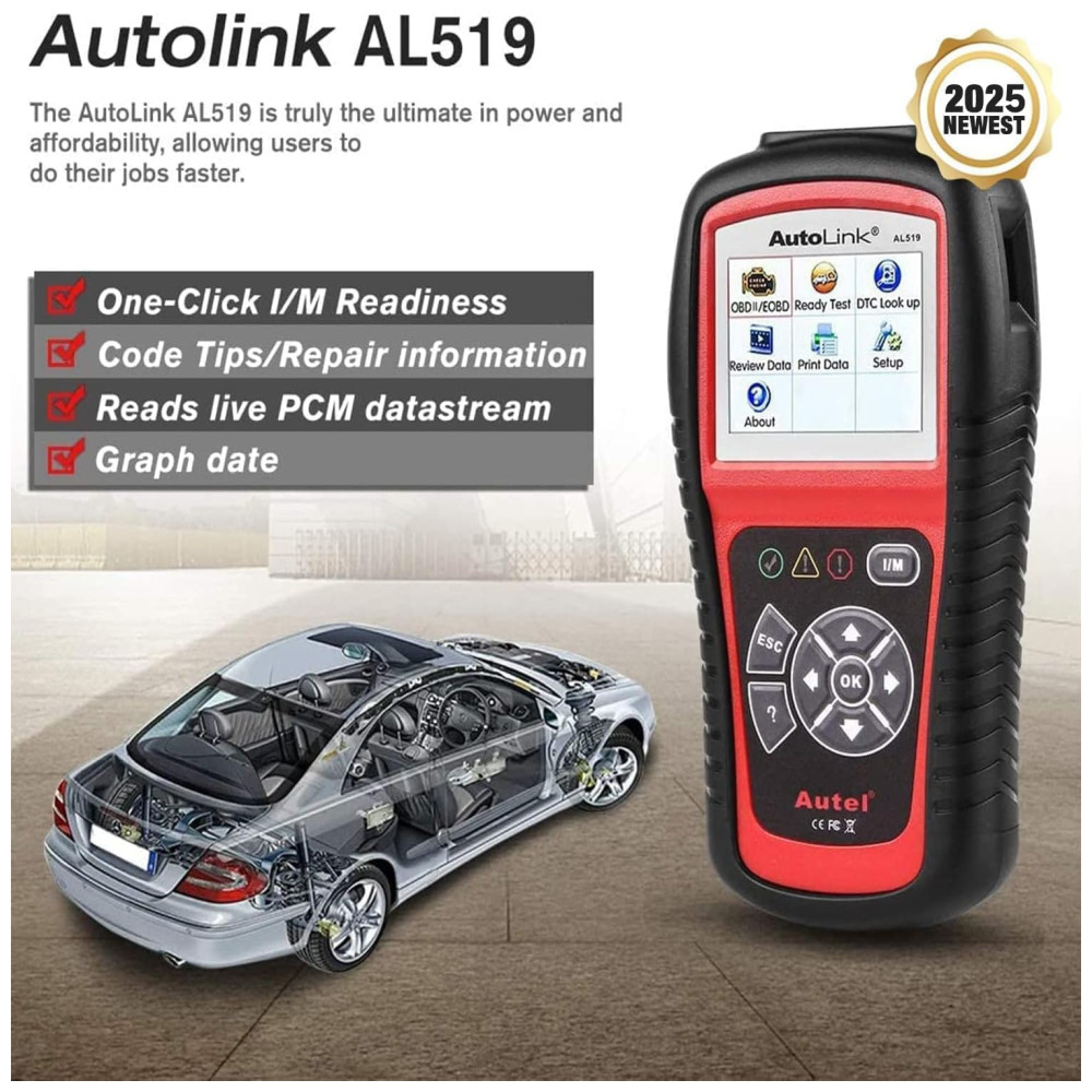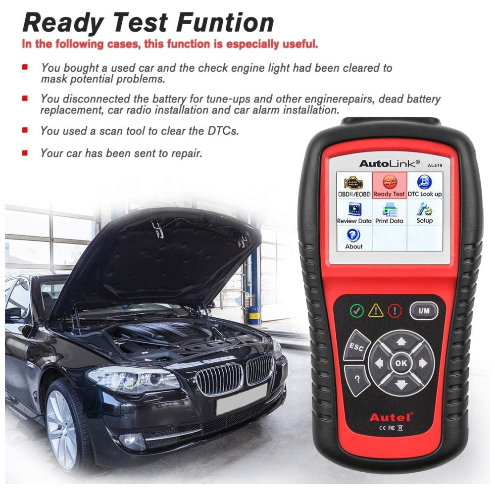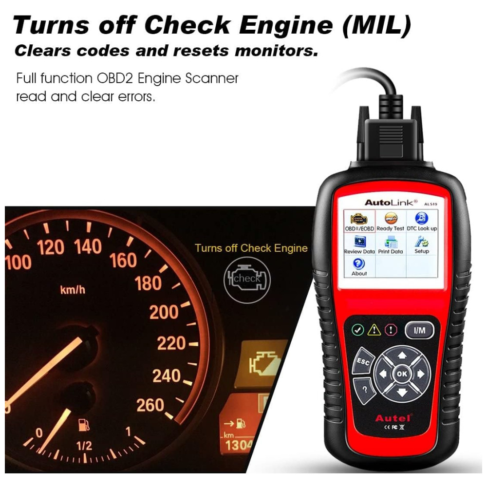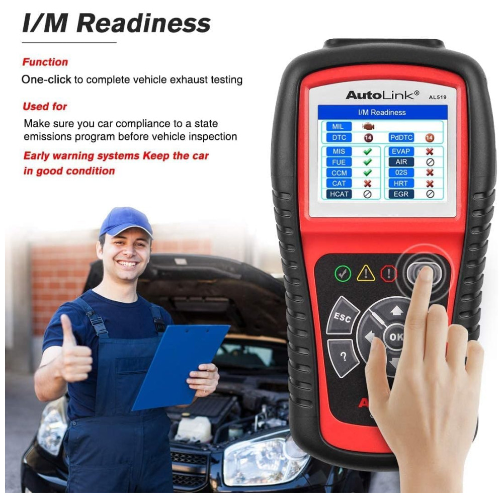 s recursos aprimorados A ferramenta de diagnóstico AL519 OBDII apresenta o One Click Smog Check patenteado, AVOmeter fácil de ler para testar tensão, continuidade e corrente na ponta do dedo, capaz de diagnosticar sistemas de carregamento de 12V, sistemas de partida e condição de bateria descarregada, memória , backup de bateria para revisão e impressão de dados via PC para análise posterior