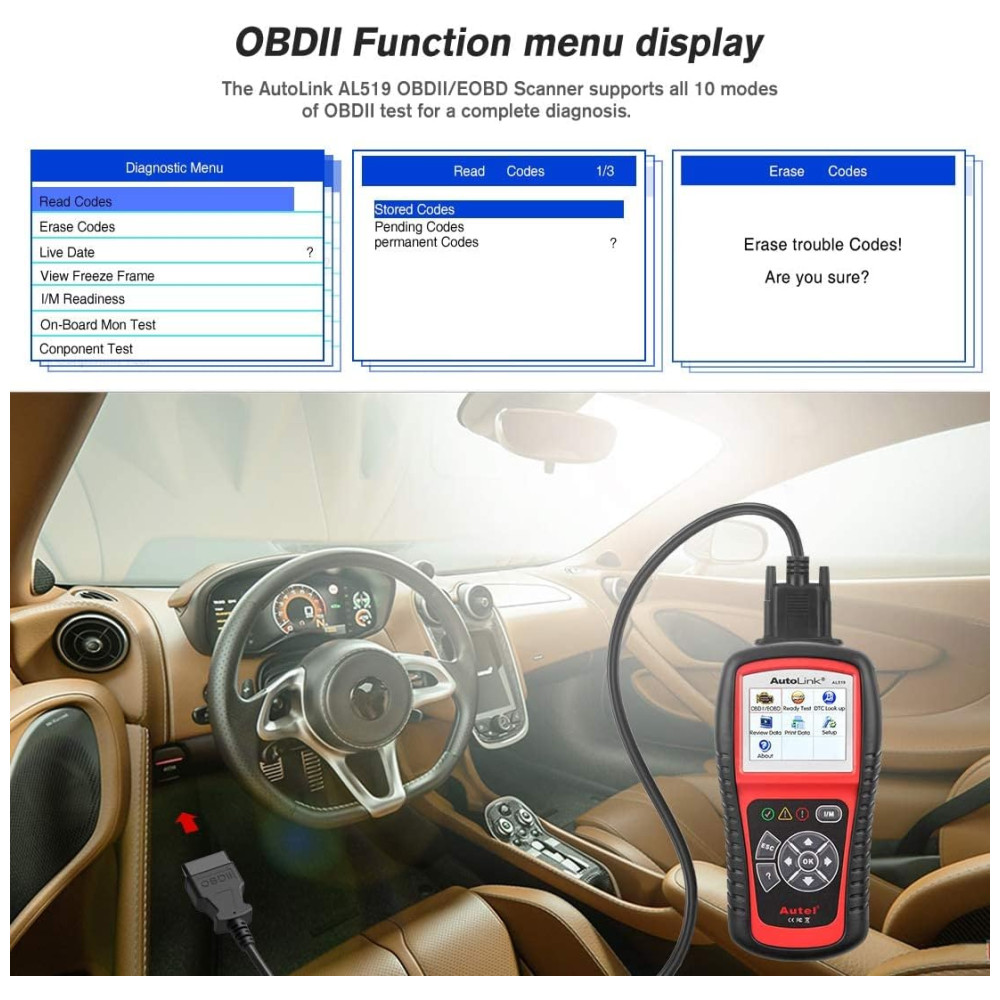 Ampla cobertura de veículos A ferramenta de diagnóstico de automóveis Autel AutoLink AL519 suporta todos os protocolos OBD2 KWP2000, ISO2000, ISO9141, J1850 VPW, J1850 PWM e CAN e pode funcionar em quase todos os veículos compatíveis com OBDII pós 1996 para carros vendidos nos EUA, pós 2006 para carros baseados na UE e pós 2009 para carros baseados na Ásia.