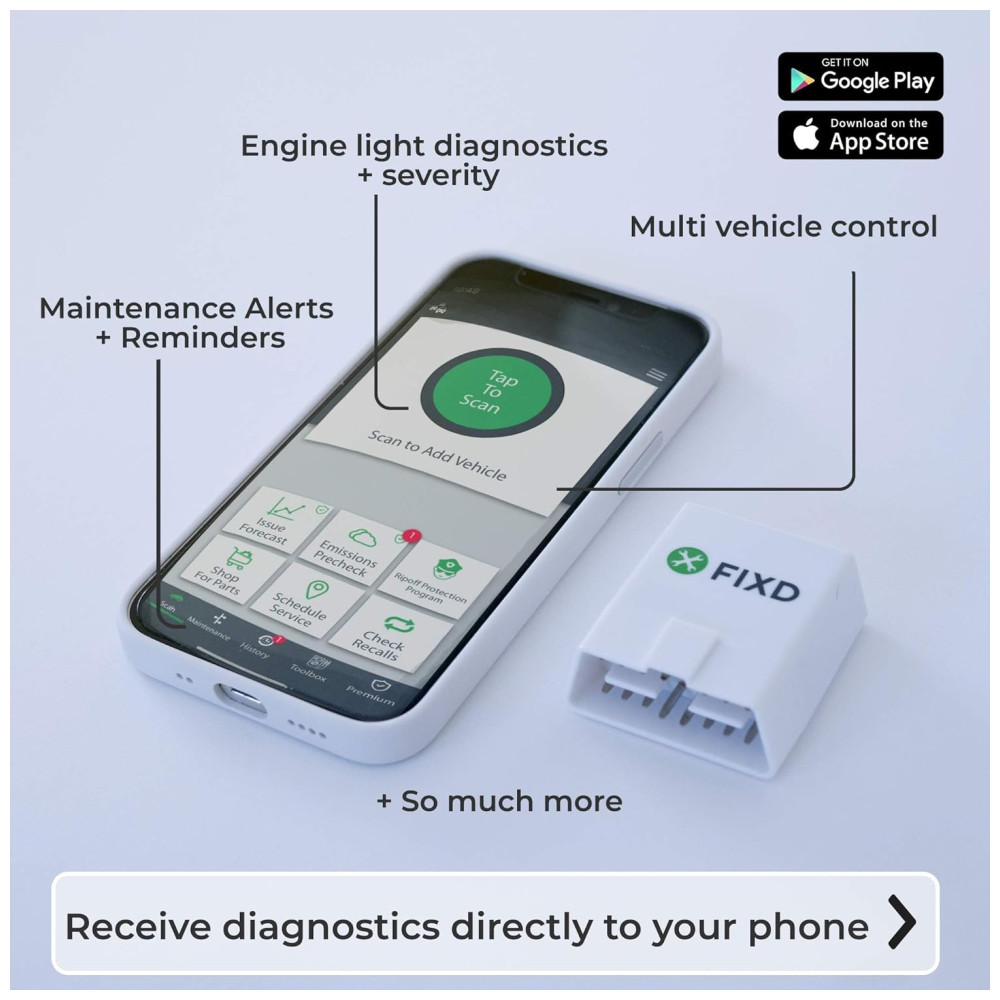 Recursos Adicionais: Monitoramento automático de manutenção, suporte ao usuário via FIXD Premium por 14 dias