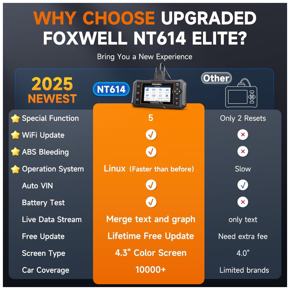 Scanner OBD2 FOXWELL NT614 Elite – Atualização WiFi 5 Serviços de Reinicialização ABS Bleeding e Mais