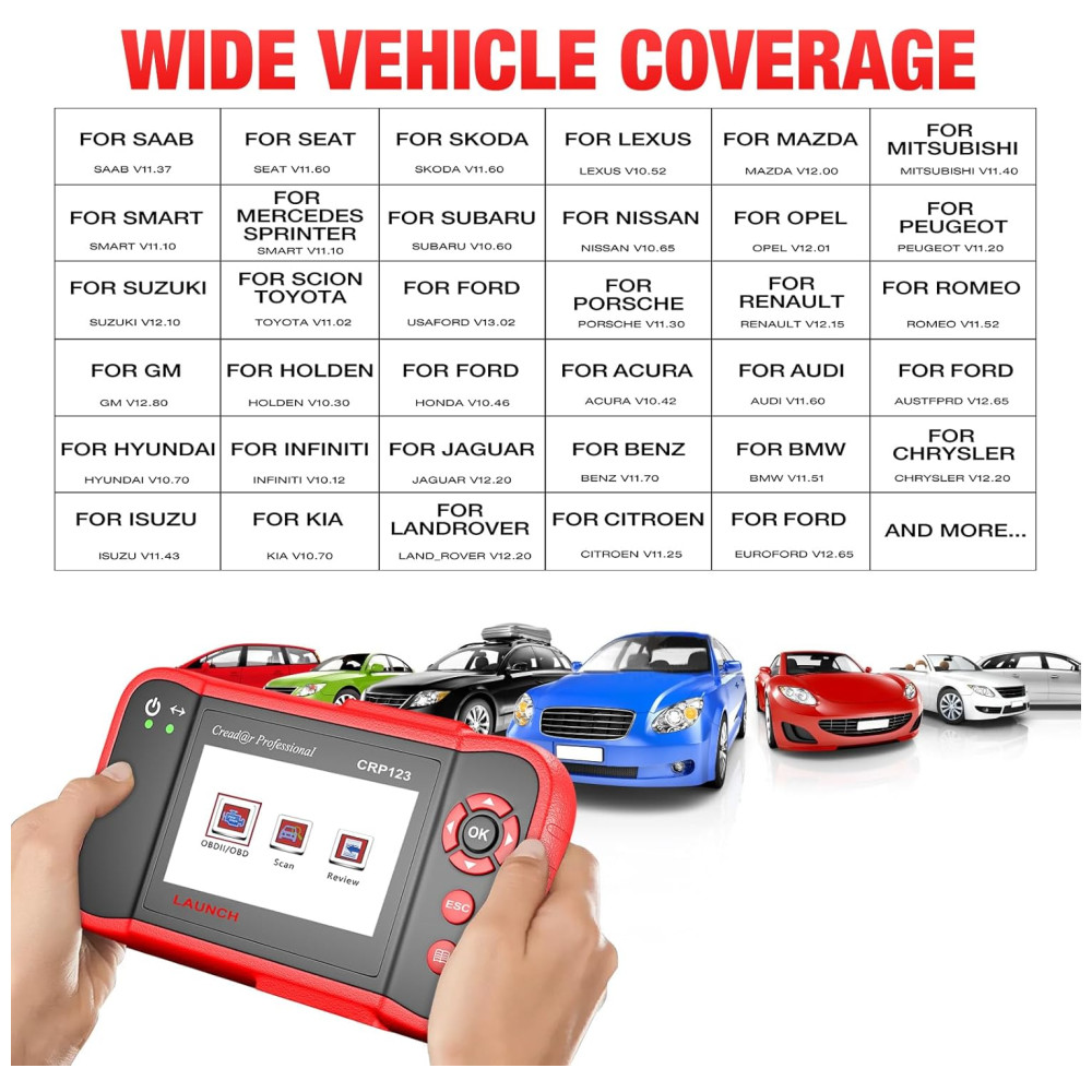 O scanner LAUNCH CRP123 V2.0 Elite é compatível com mais de 57 marcas e mais de 10.000 modelos de veículos, abrangendo carros americanos, asiáticos e europeus, incluindo marcas como Audi, Porsche, Saab, Jaguar, entre outras. Ele oferece diagnóstico completo dos sistemas de motor, ABS, SRS e transmissão, além de funções avançadas como reset de óleo, adaptação do acelerador e recalibração do SAS.