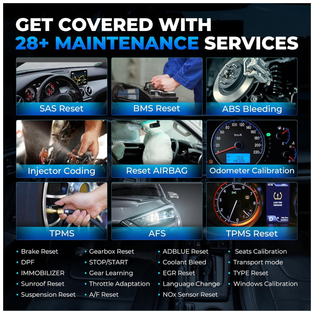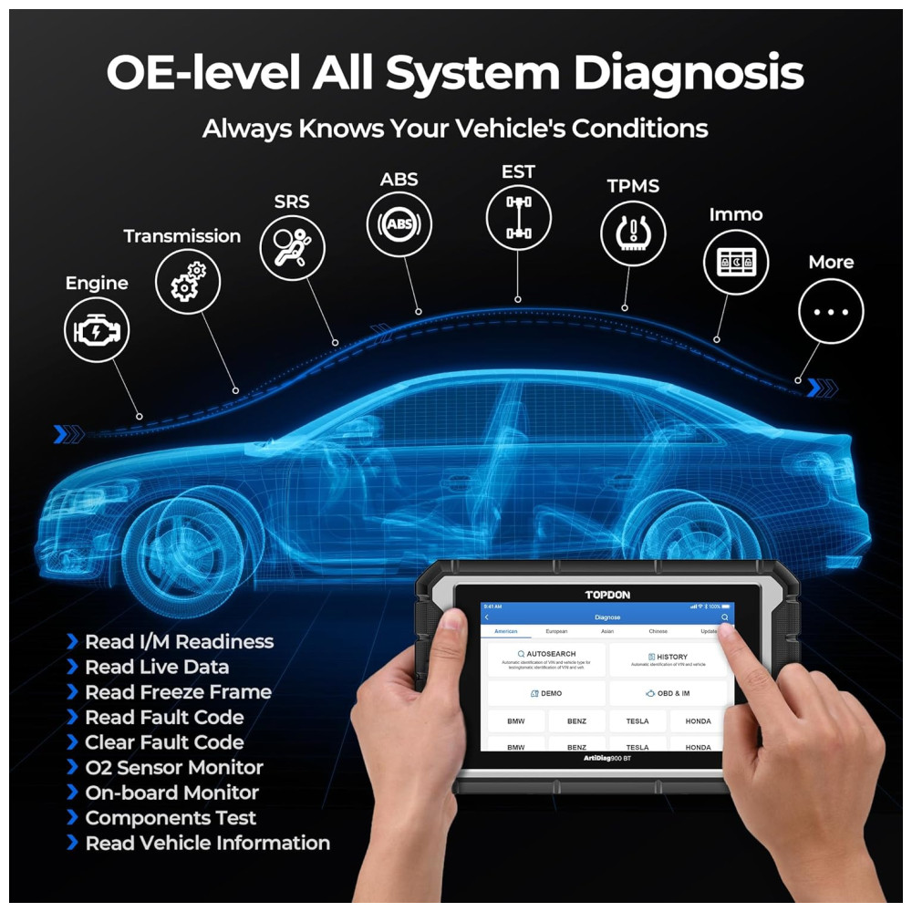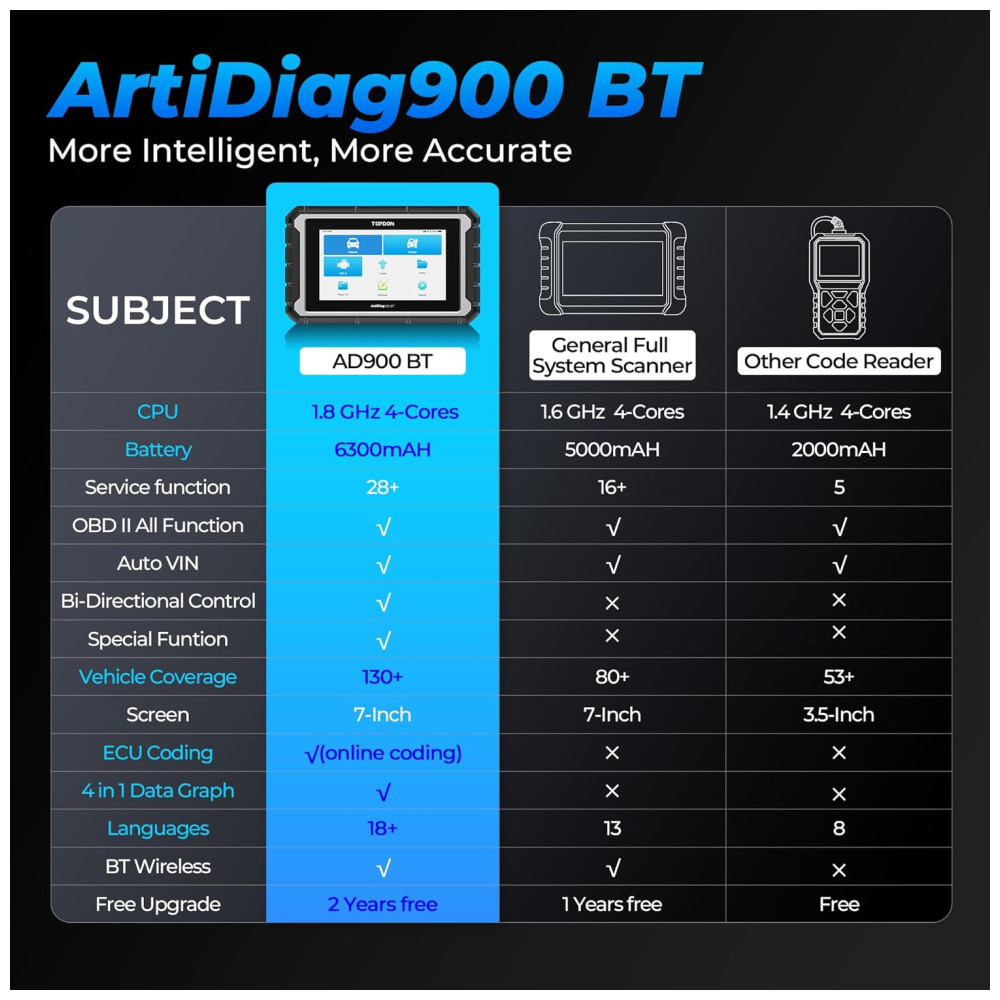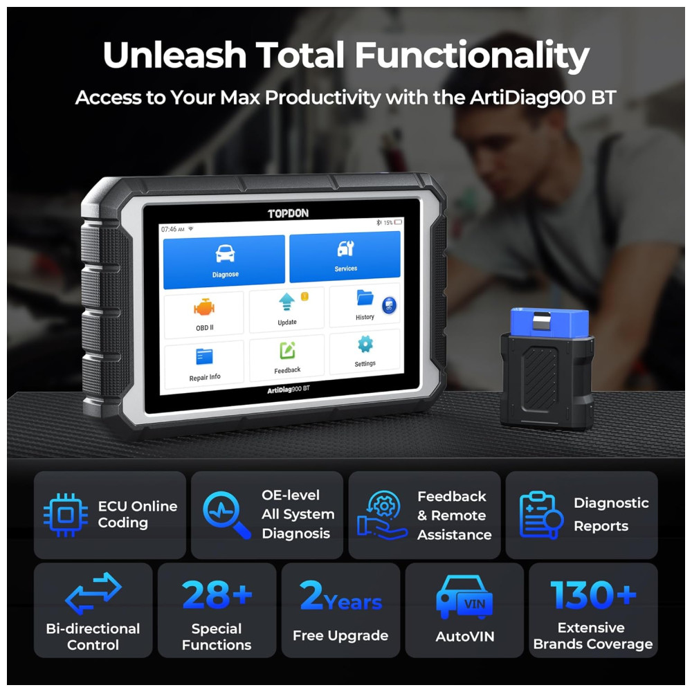 O scanner TOPDON AD900BT (também chamado ArtiDiag900BT) é compatível com mais de 130 marcas de veículos, oferecendo diagnóstico completo de todos os sistemas do carro, funções bidirecionais, codificação ECU e 28 serviços avançados de manutenção, como reset de óleo, sangramento de freio, adaptação do acelerador, entre outros.