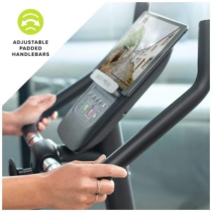 Frequência cardíaca de telemetria ativada e frequência cardíaca de alça ergonomicamente posicionada para uma posição de condução relaxada ao usar um programa de frequência cardíaca
